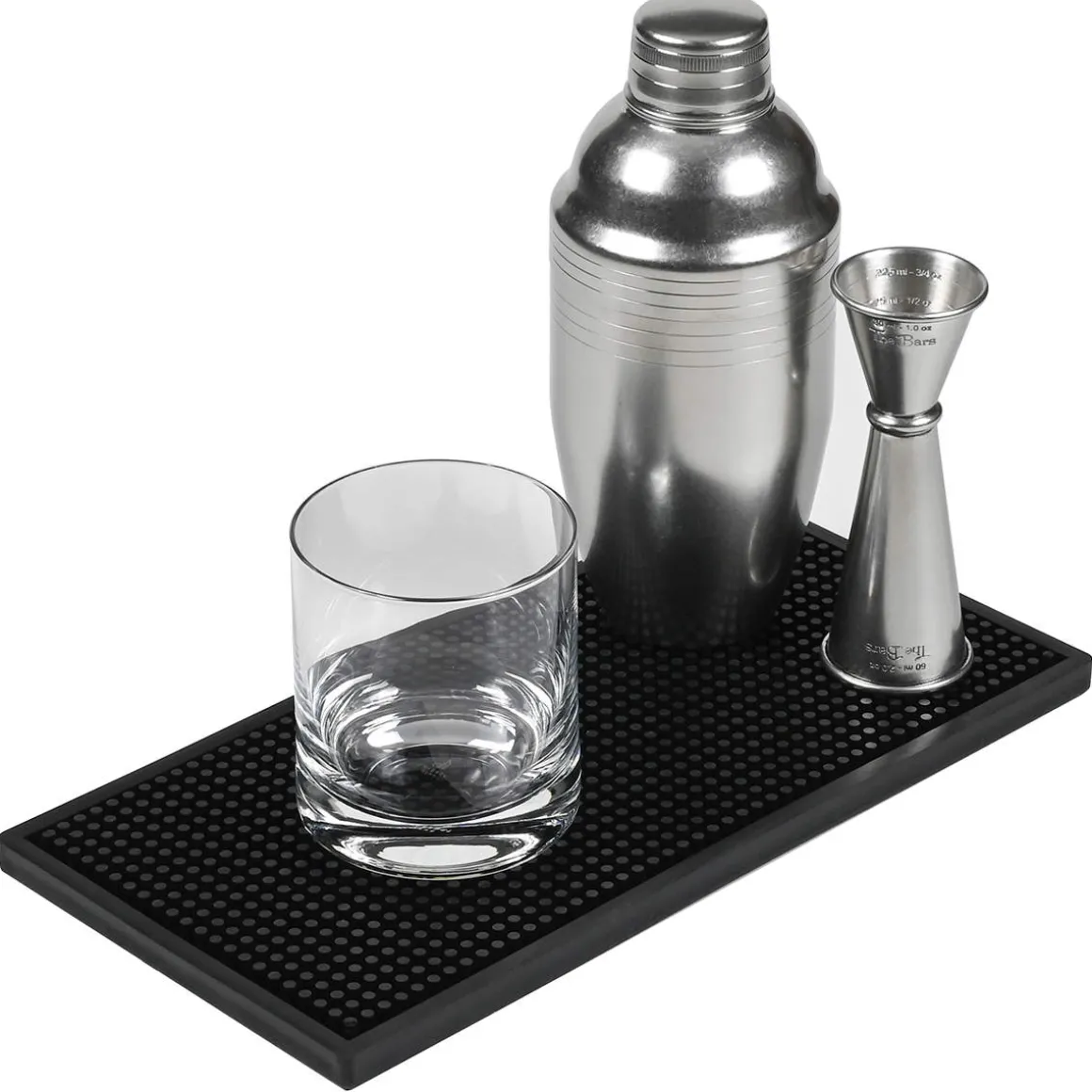 Stellen Gläser, Cocktailshaker und anderes Barzubehör auf der Barmatte ab. Herablaufende Flüssigkeit läuft in die Zwischenräume der Barmatte und wird dort gesammelt. So bleibt ihre Theke sauber und das Wasser sammelt sich nicht am Fuß der Cocktailgläser.