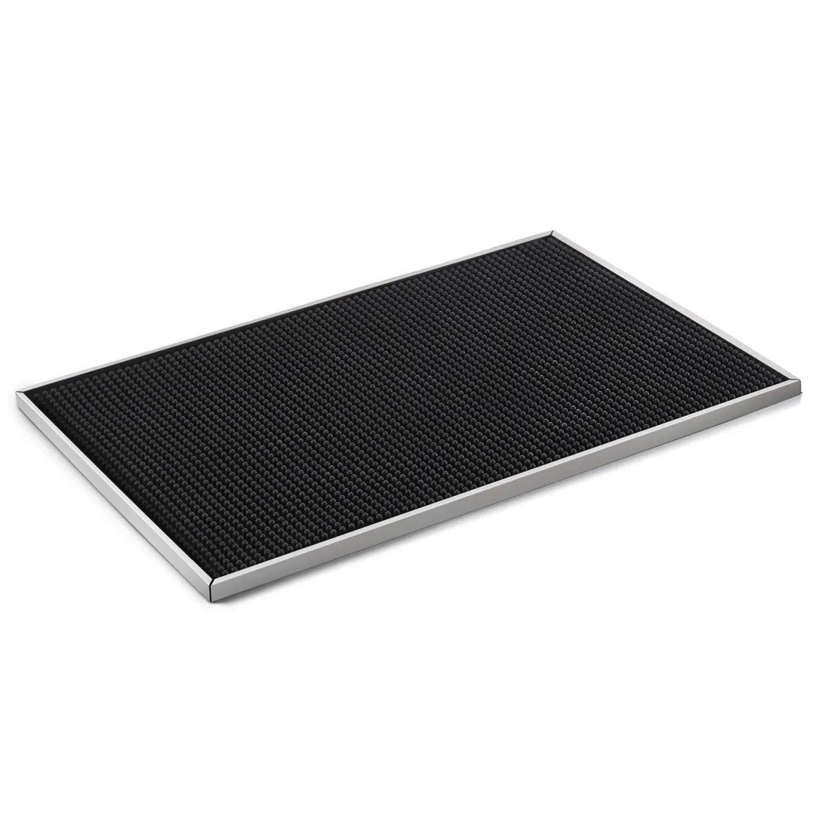 Diese großzügige Barmatte mit Edelstahlrahmen bietet viel Platz für Gläser, Shaker und weiteres Barzubehör. Sie ist perfekt für stark frequentierte Arbeitsbereiche geeignet. Sie schafft eine saubere, strukturierte Arbeitsfläche und hilft dabei, den Tresen vor Feuchtigkeit, Kratzern und Verschmutzungen zu schützen.