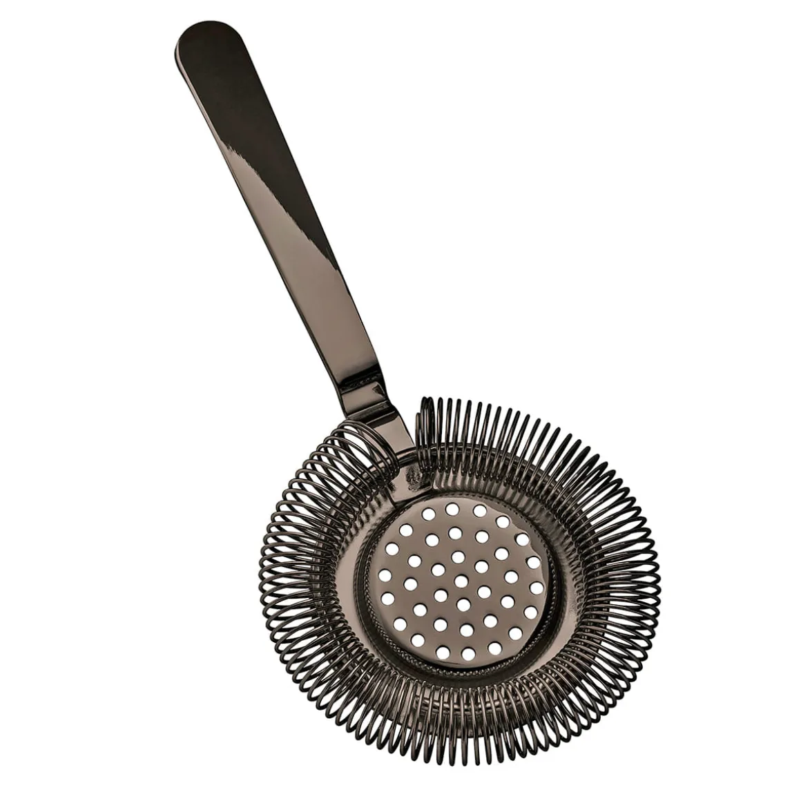 Hawthorne Strainer aus Edelstahl mit schwarzer Beschichtung. Bei diesem Barsieb ist die Trägerplatte für die Spirale rund geformt und etwas kleiner als üblich. Die eng gedrehte Spirale wurde auf die Außenkante der Trägerplatte gesetzt und läuft vollständig um diese herum. Hierdurch erhält der Hawthorne Strainer wieder einen großen Durchmesser. Außerdem wurden keine Arme zum Auflegen auf den Shakerrand angebracht. Statt dessen besitzt der Griff eine Kerbe zur Fixierung des Barsiebs am Rand des Shakers oder Rührglases.