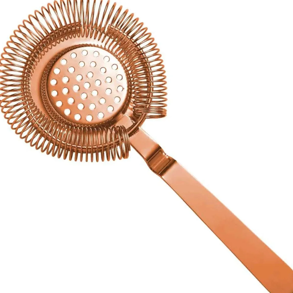 Der Calabrese Hawthorne Strainer in Kupfer zeichnet sich durch sein Design ohne Ohren zum Auflegen auf den Shaker aus. Das Barsieb wird statt dessen in den Shaker gelegt und hält durch die Mulde im Griff seine Position. Die eng gedrehte Spirale läuft einmal um die gesamte Mittelplatte bis an den Griff. Dies ermöglicht es geworfene Cocktails zu mixen, bei denen der Cocktails von einem Shaker-Becher in den anderen mit einem großen Abstand durch die Luft geschüttet wird.