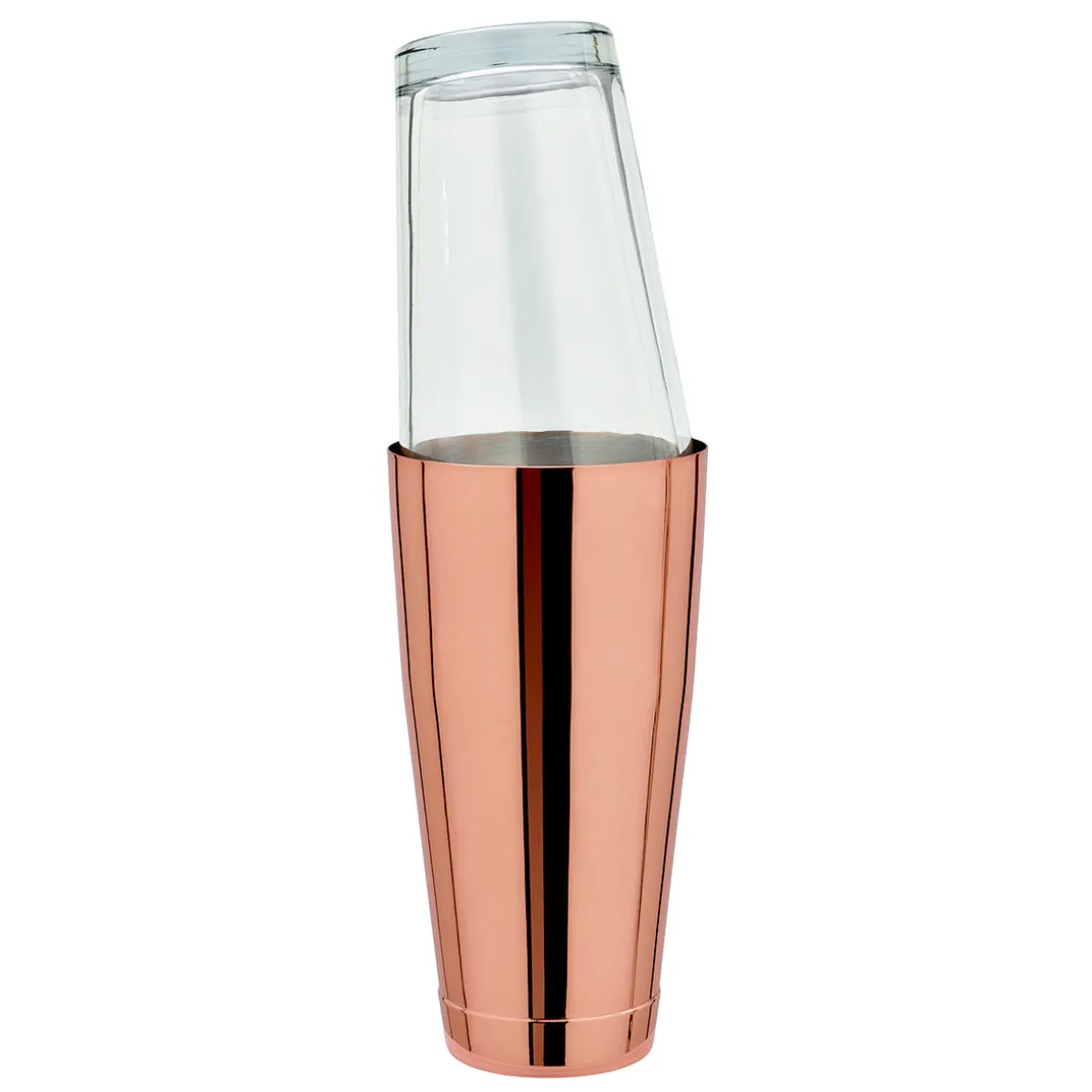 Vollständiger Cocktailshaker bestehend aus einem Boston Shaker Becher und einem passenden Mixingglas. Der kupferfarbene Becher ist aus Edelstahl gefertigt und hat ein Fassungsvermögen von 28 oz / 830 ml. Der Edelstahlbecher besitzt eine doppelte Bodenplatte für einen sicheren Stand und um höhere Stabilität gegen Verformungen. Das Mixingglas ist aus stabilem Sicherheitsglas hergestellt, so dass es die hohen Ansprüchen in Cocktailbars erfüllt. Das Mixingglas hat ein Volumen von 400 ml.