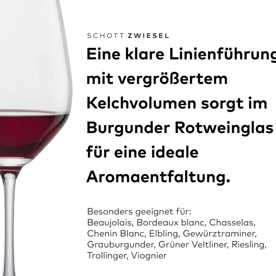 - Großzügige Rotwein-Form – bietet mehr Raum für komplexe Aromen