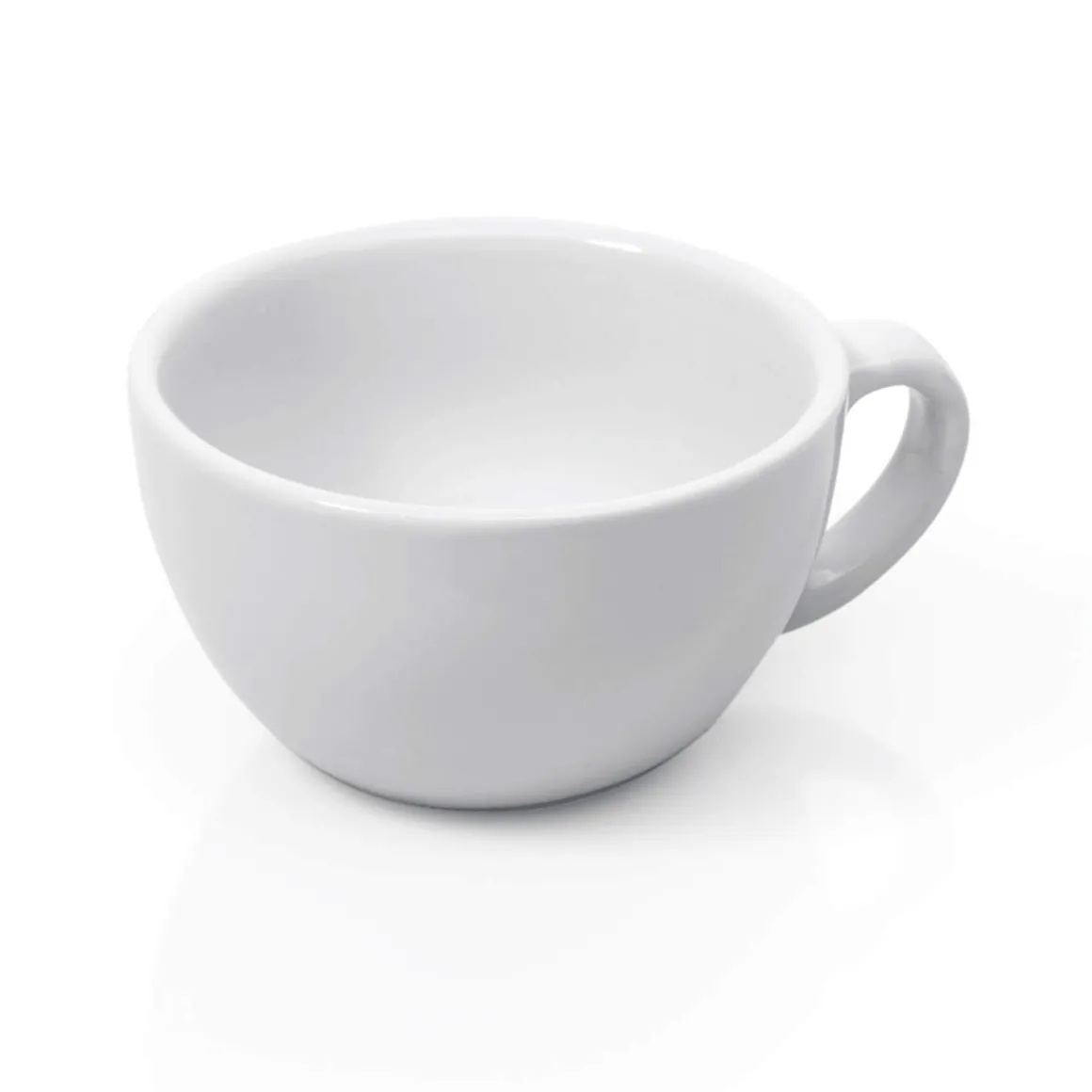 6 weiße Cappuccino Tassen aus Porzellan mit elegantem Design und einem Volumen von 200 ml.