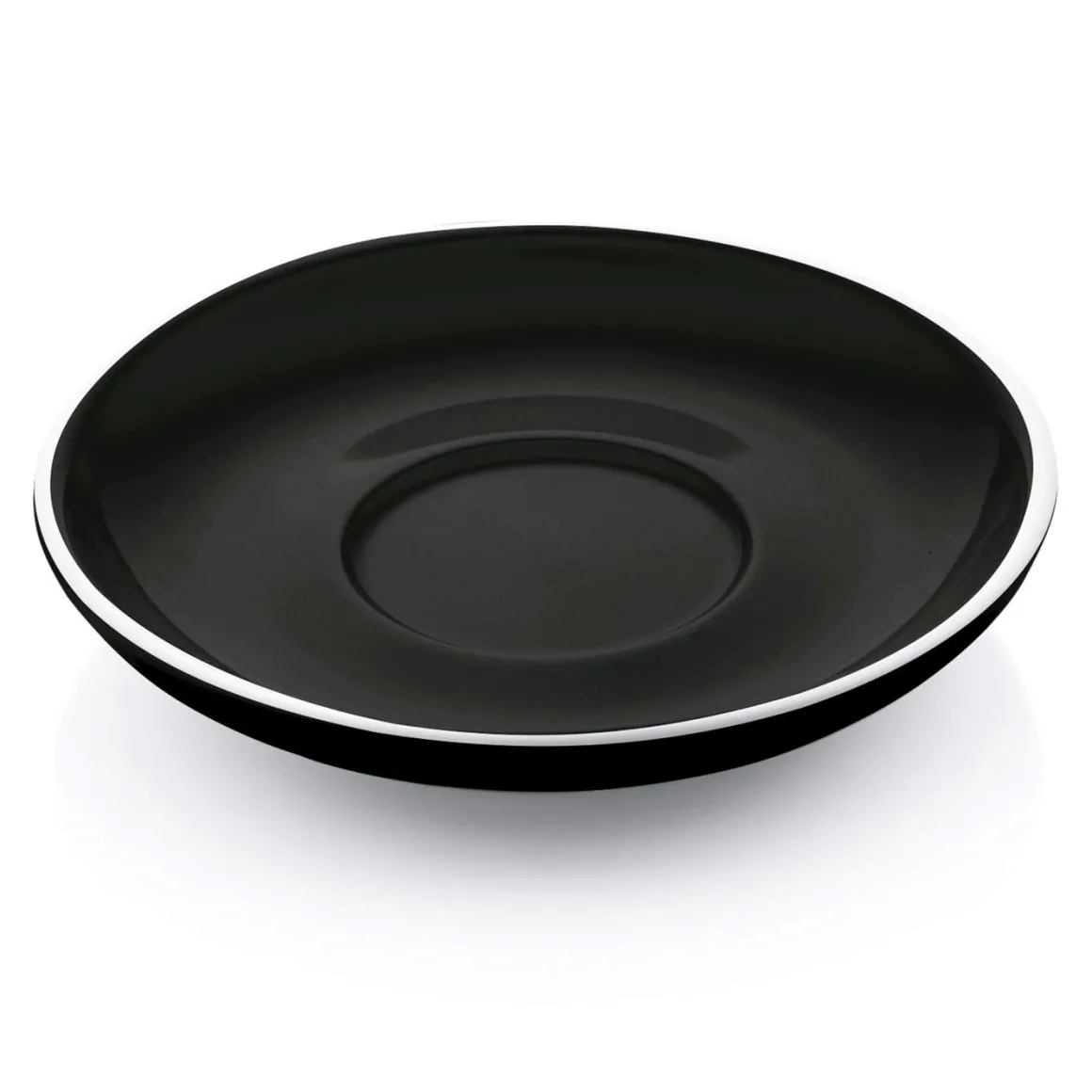 Die Cappuccino Untertassen Italia Black haben eine glänzend schwarze Oberfläche mit einer weiß abgesetzten Kante abgestimmt auf die Tassen Italia Black.