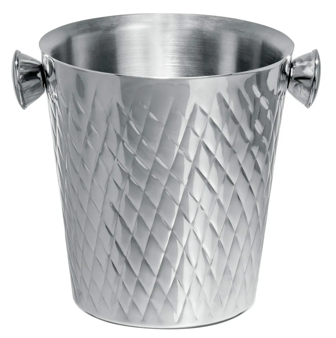 Doppelwandiger Sektkühler aus Edelstahl mit Diamantmuster und zwei Griffen. Durch die doppelwandige Ausführung bleiben die Flasche und die Eiswürfel im Sektkühler besonders lange kalt. Durch das höhere Gewicht hat der Sektkühler einen deutlich stabileren Stand gegenüber einer einwandigen Ausführung. Die Innenseite des Sektkühlers ist gebürstet, wodurch Nutzungsspuren weniger auffallen. Der Flaschenkühler läuft nach unten leicht konisch zu.