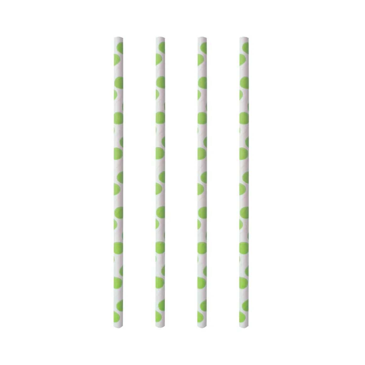 Weiße Cocktail Strohhalme aus Papier mit grünen Punkten. Die Trinkhalme haben eine Länge von 20 cm und einen Durchmesser von 6 mm.