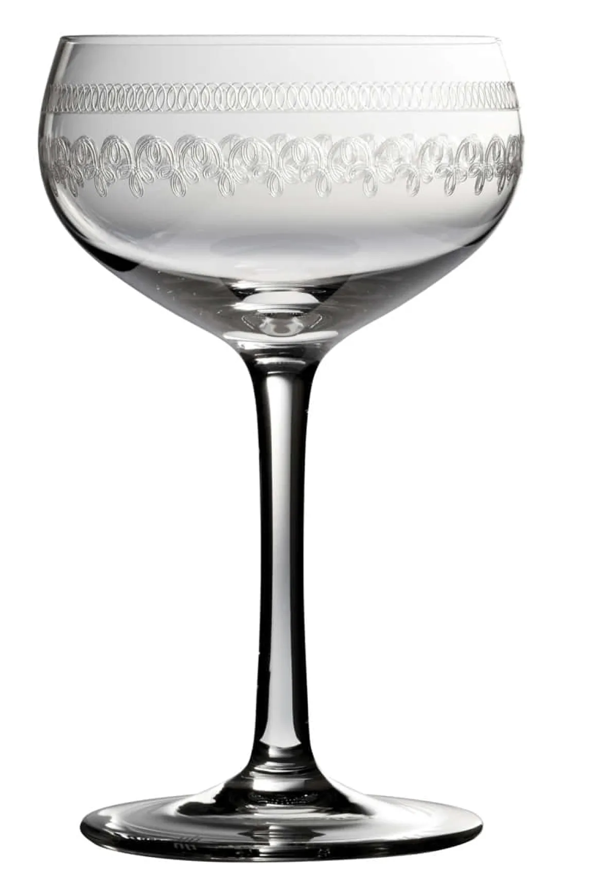 Passend zur Renaissance der Cocktailkultur vom Anfang des letzten Jahrhunderts hat diese Variante des Retro Coupe eine feine eingeätzte Verzierung im Stil der 1910er Jahre.