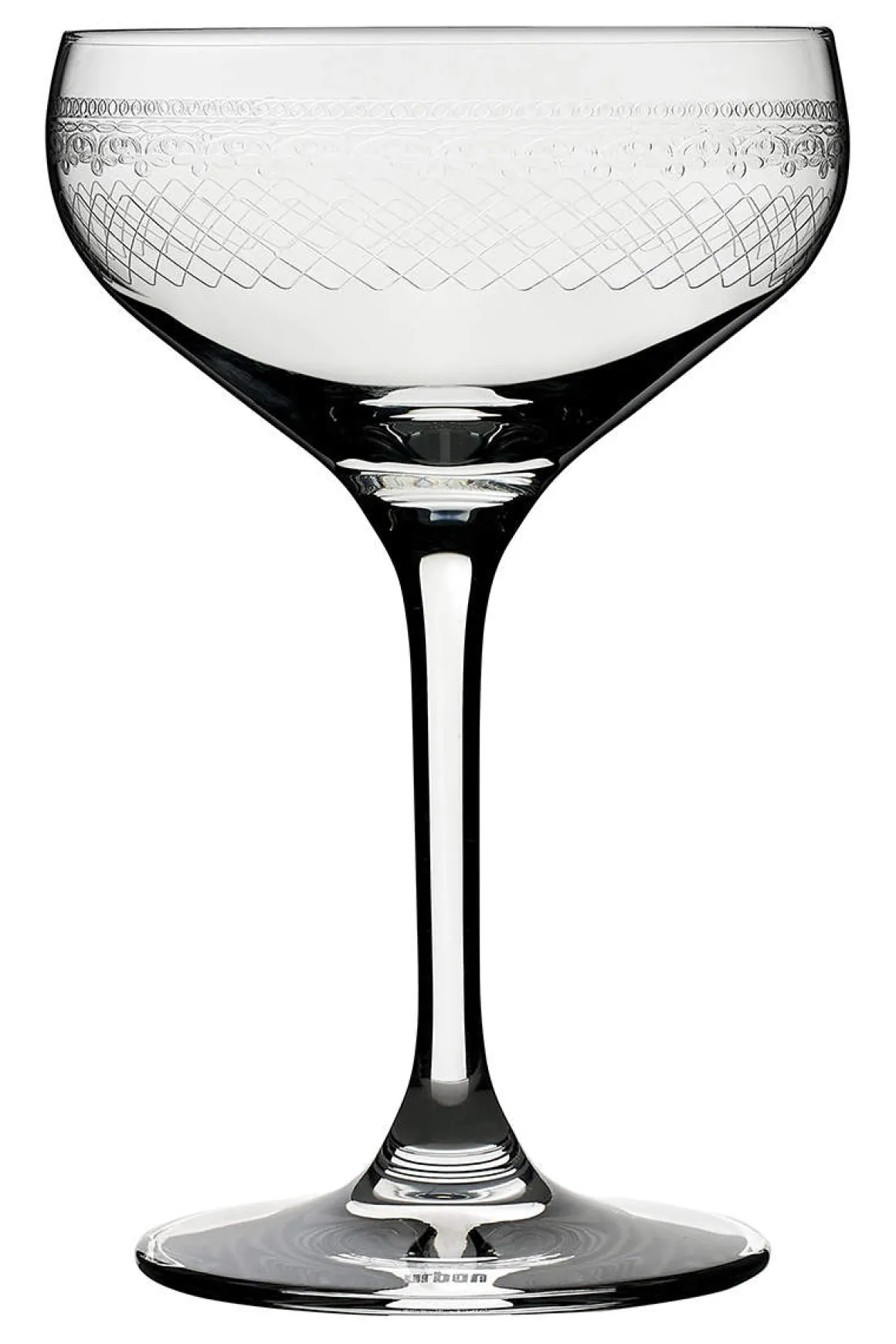 Passend zur Renaissance der Cocktailkultur vom Anfang des letzten Jahrhunderts hat diese Variante des Retro Coupe eine feine eingeätzte Verzierung im Stil der 1910er Jahre.