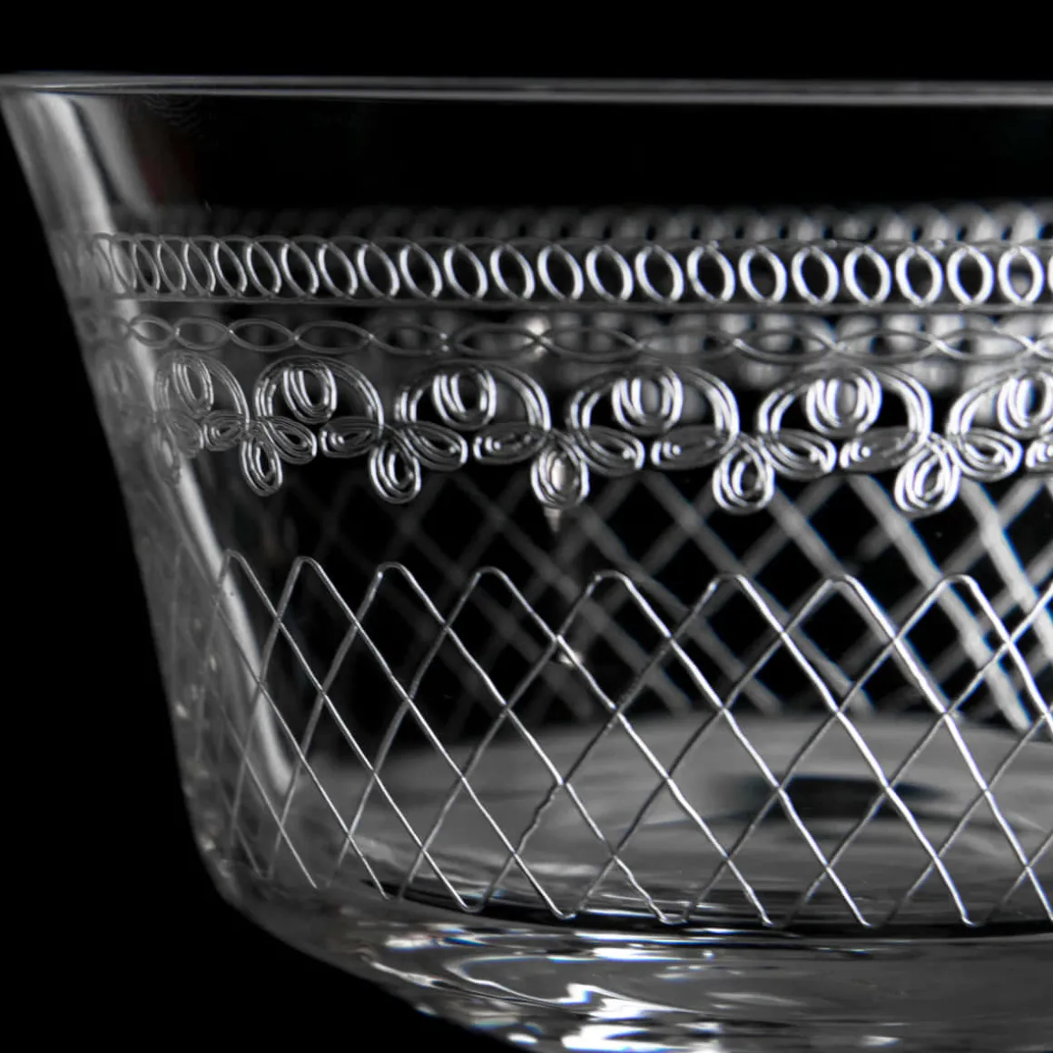 Elegantes Cocktailglas mit feiner Verzierung im Stil der 1910er Jahre von UrbanBar. Mit dieser Cocktailschale im Vintage-Look erhalten Sie einen Hingucker für ihre Cocktailbar oder den privaten Cocktailabend. Der untere Teil der Schale ist mit einem feinen Rautenmuster verziert und darüber liegen zwei umlaufende geschwungene Bänder.