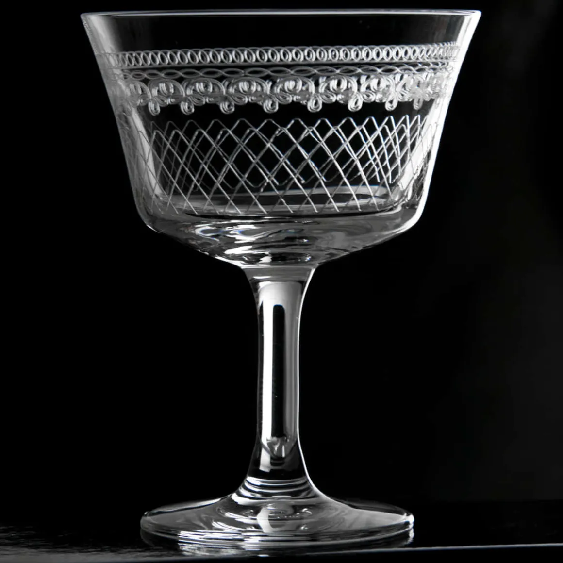 Das Retro Fizz Cocktailglas ist auch in Uni und vier weiteren verzierten Varianten erhältlich. Außerdem sind Tumbler, Longdrinkgläser und 5 weitere Cocktailschalen mit 1910er Verzierung erhältlich.