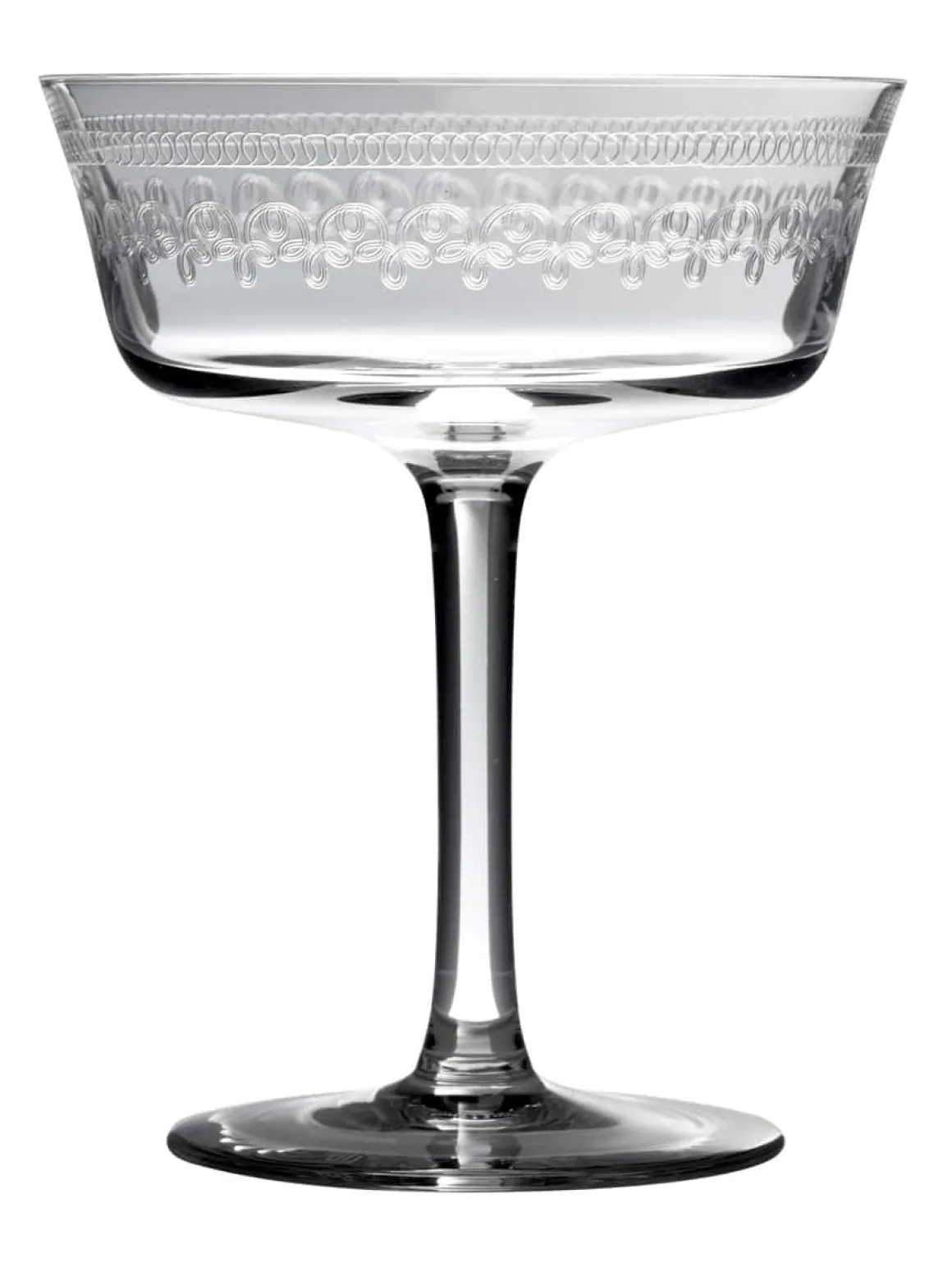 Das Retro Fizzio Cocktailglas ist auch in Uni und drei weiteren verzierten Varianten erhältlich. Außerdem sind Tumbler, Longdrinkgläser und 5 weitere Cocktailschalen mit 1910er Verzierung erhältlich.