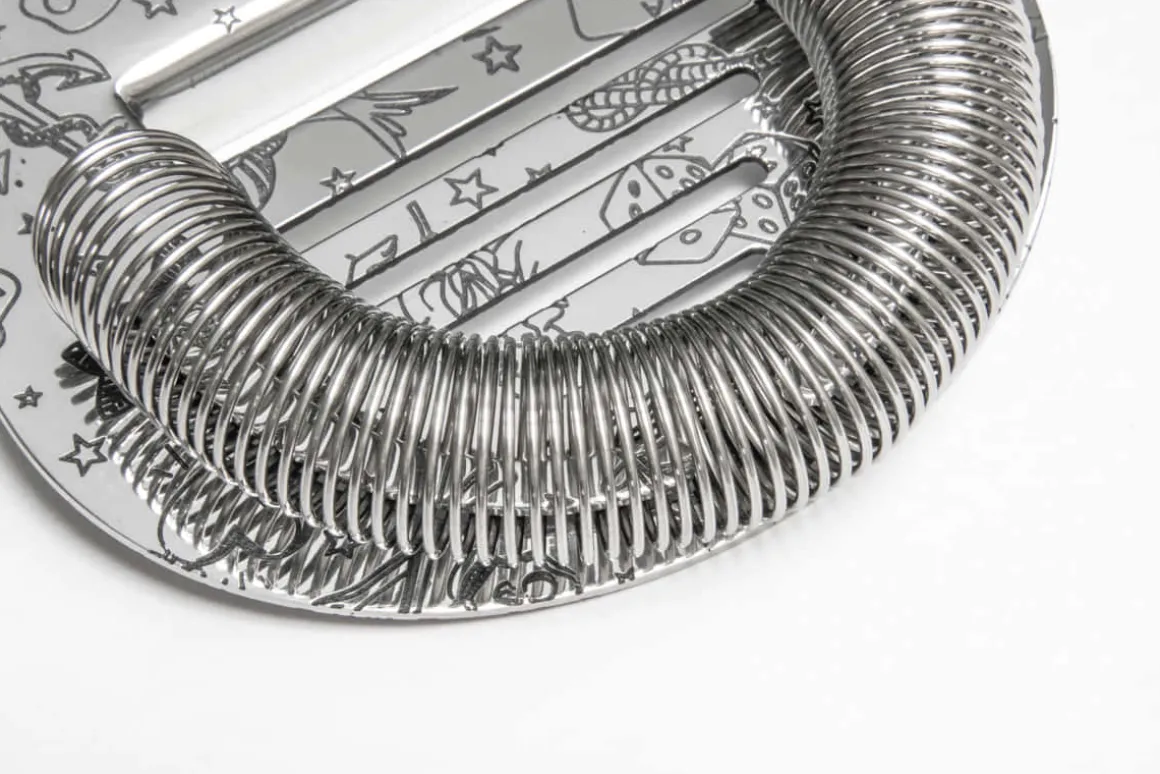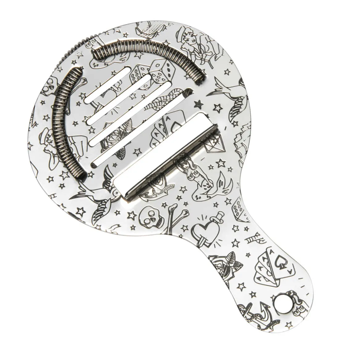 Der Coley Hawthorne Strainer von Urban Bar ist aus hochwertigem 18/8 Edelstahl gefertigt und besitzt ein poliertes Finish. Das Barsieb wurde mit Tattoo Motiven wie Ankern, Meerjungfrauen und Totenköpfen verziert. Die Motive wurden in die Trägerplatte eingeätzt, mit lebensmittelechter schwarzer Tinte gefärbt und sind spülmaschinenfest. Bringen Sie Urlaubsfeeling mit in ihre Cocktailbar.