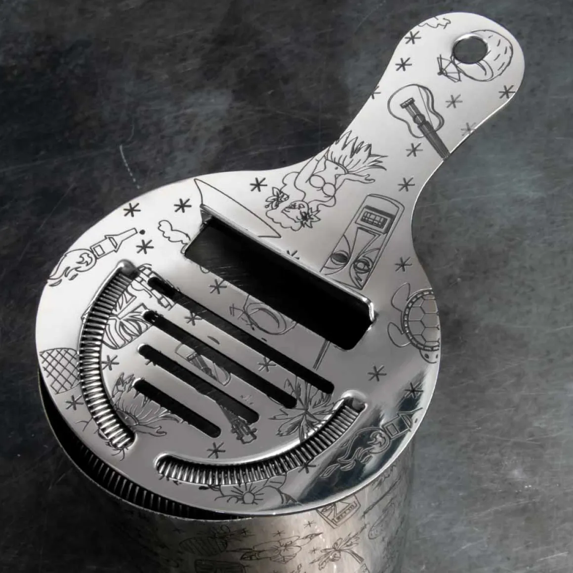 Das Barsieb ist auch mit Tattoo-Motiven und ohne Verzierung in den Farben Silber und Kupfer erhältlich.