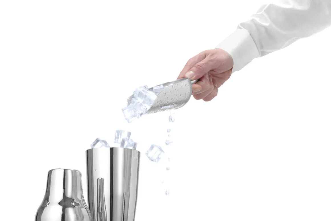 Eisschaufel aus Aluminium mit vier länglichen Löchern. Durch die Löcher kann beim entnehmen der Eiswürfel aus einem Behälter das Tauwasser direkt abfließen ohne in den Cocktailshaker oder das Trinkglas zu gelangen. So wird das Getränk vor übermäßigem Verwässern geschützt.