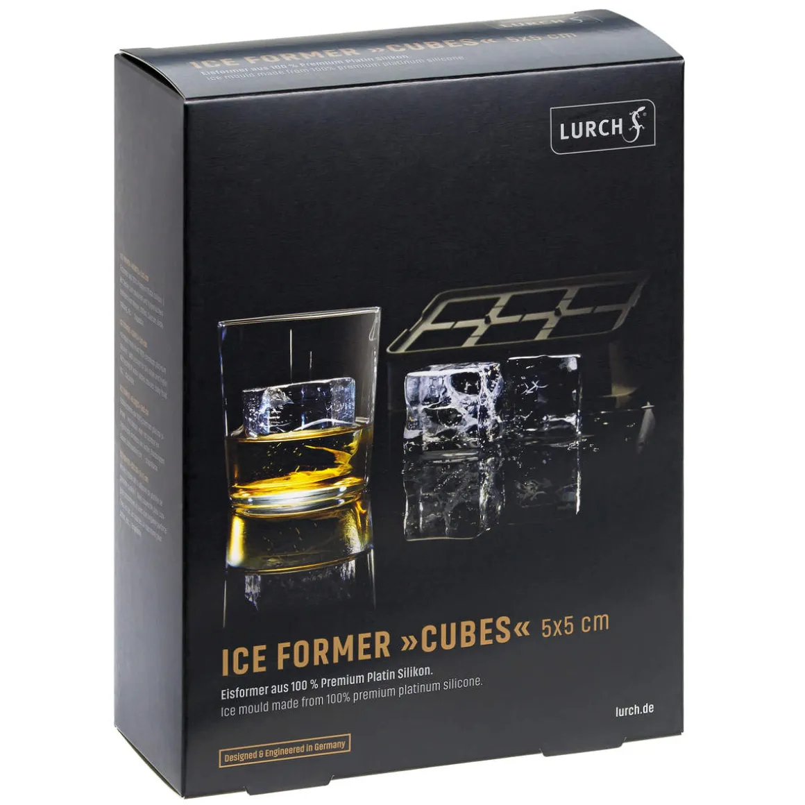 Hochwertige Eiswürfelform mit Deckel aus Platin Silikon. Die Eiswürfelform hat Einzelkammern für 6 x 5 cm Würfel.