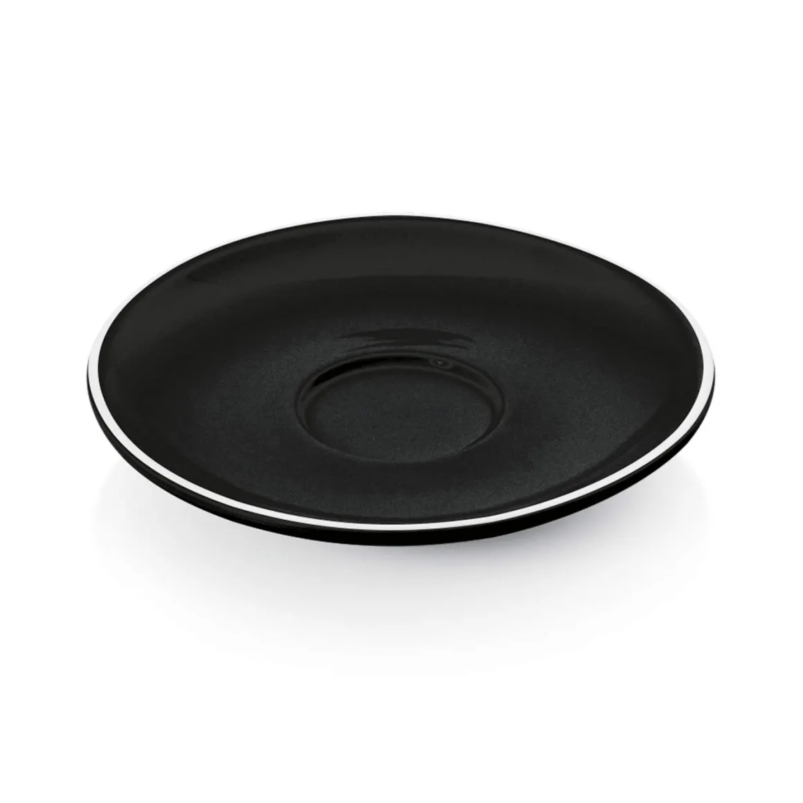 Die Espresso Untertassen Italia Black haben eine glänzend schwarze Oberfläche mit einer weiß abgesetzten Kante passend zu den Espresso Tassen Italia Black.