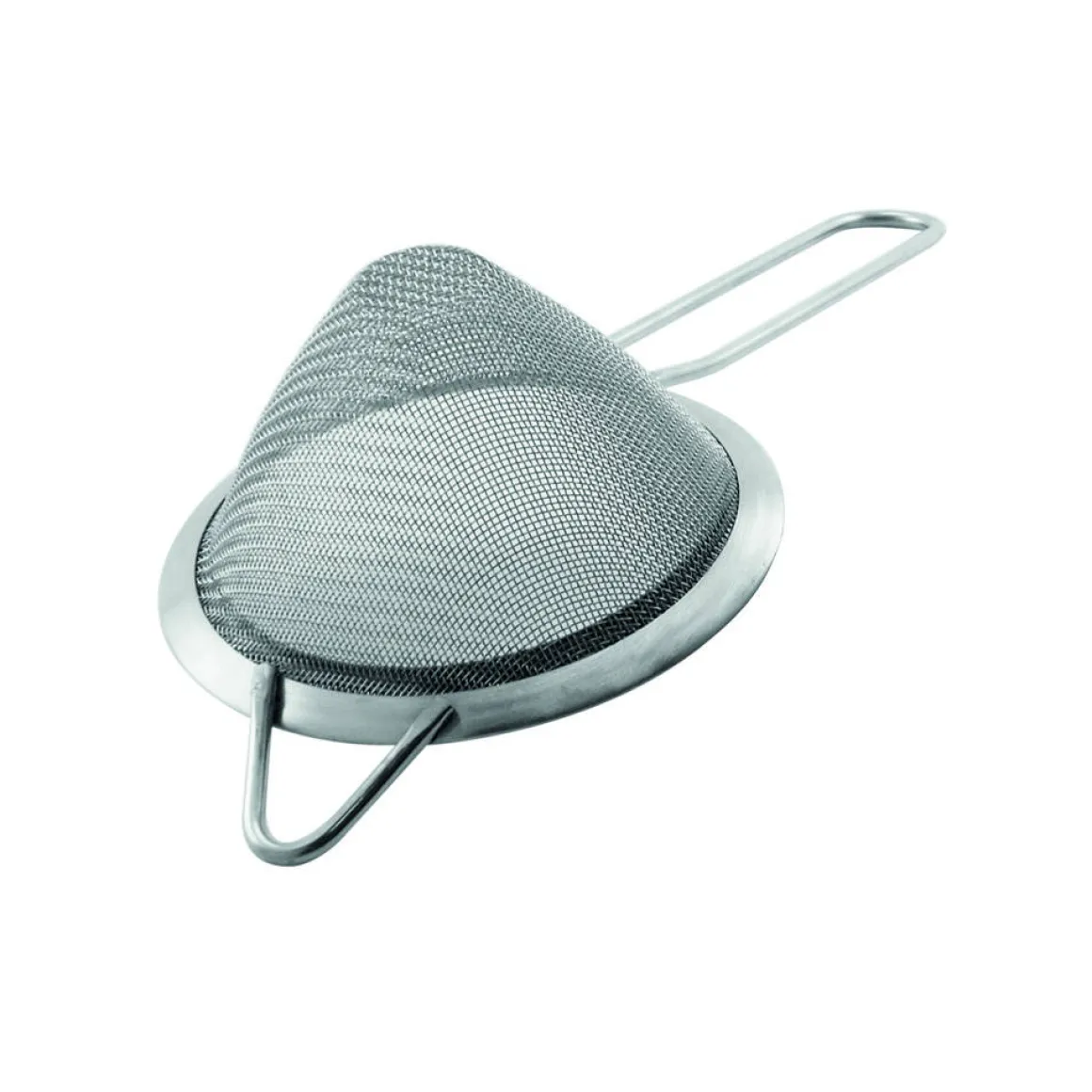Feinsieb mit konisch zulaufendem Sieb zum ausfiltern von feinen Partikeln wie Minze, Fruchtstücke oder sehr kleinem Eis. Das Feinsieb hat einen Griff aus gebogenem Edelstahl und eine Öse zum Aufhängen. Durch diese beiden Verlängerungen lässt sich das Feinsieb auch einfach auf dem Becher des Cocktailshakers ablegen und tropft in den Becher.