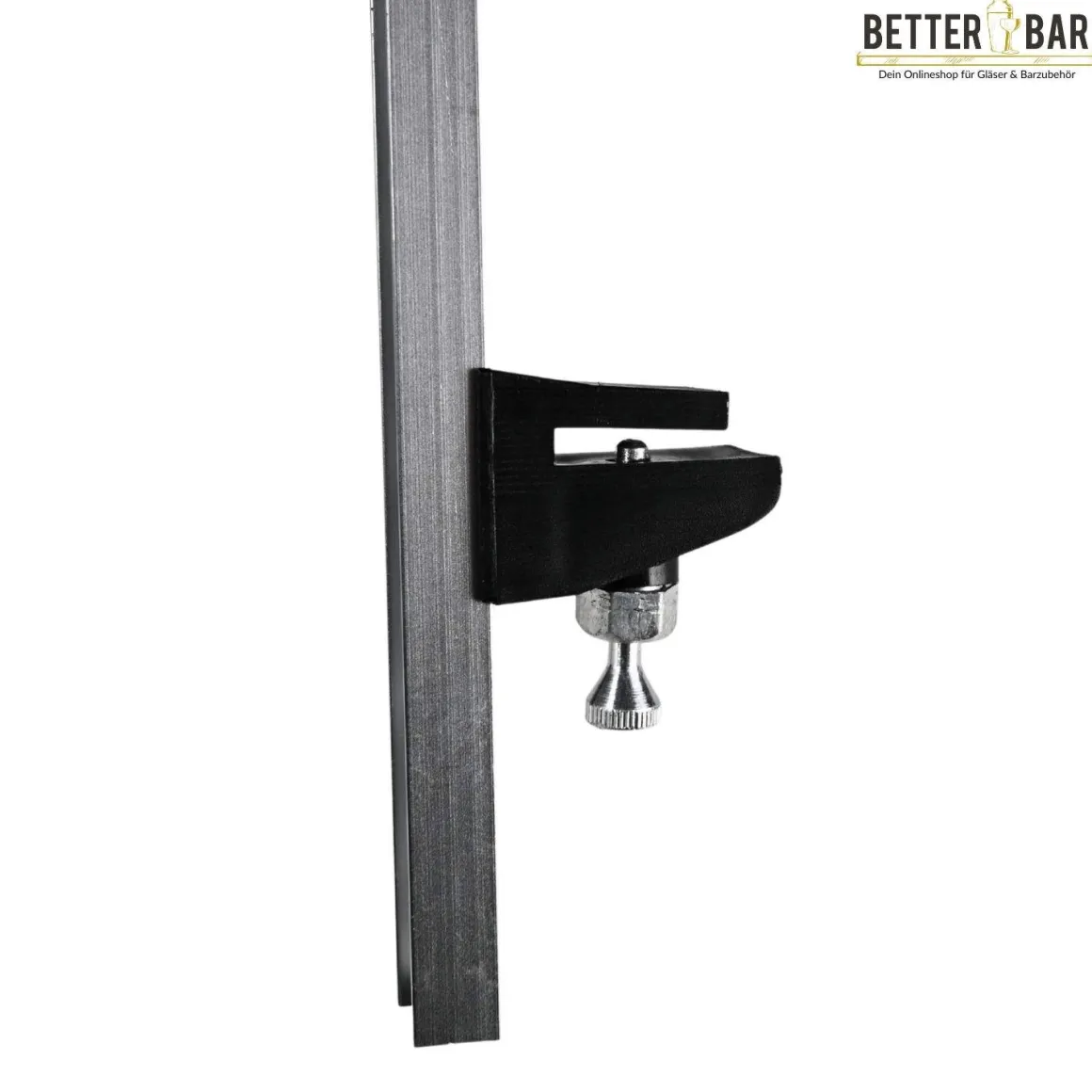 Stabile Wandhalter aus Metall für eine Flasche. Die Flasche wird mit der Öffnung nach unten zusammen mit einem Spirituosen-Dosierer befestigt und Oben mit einem verstellbaren Arm festgehalten.