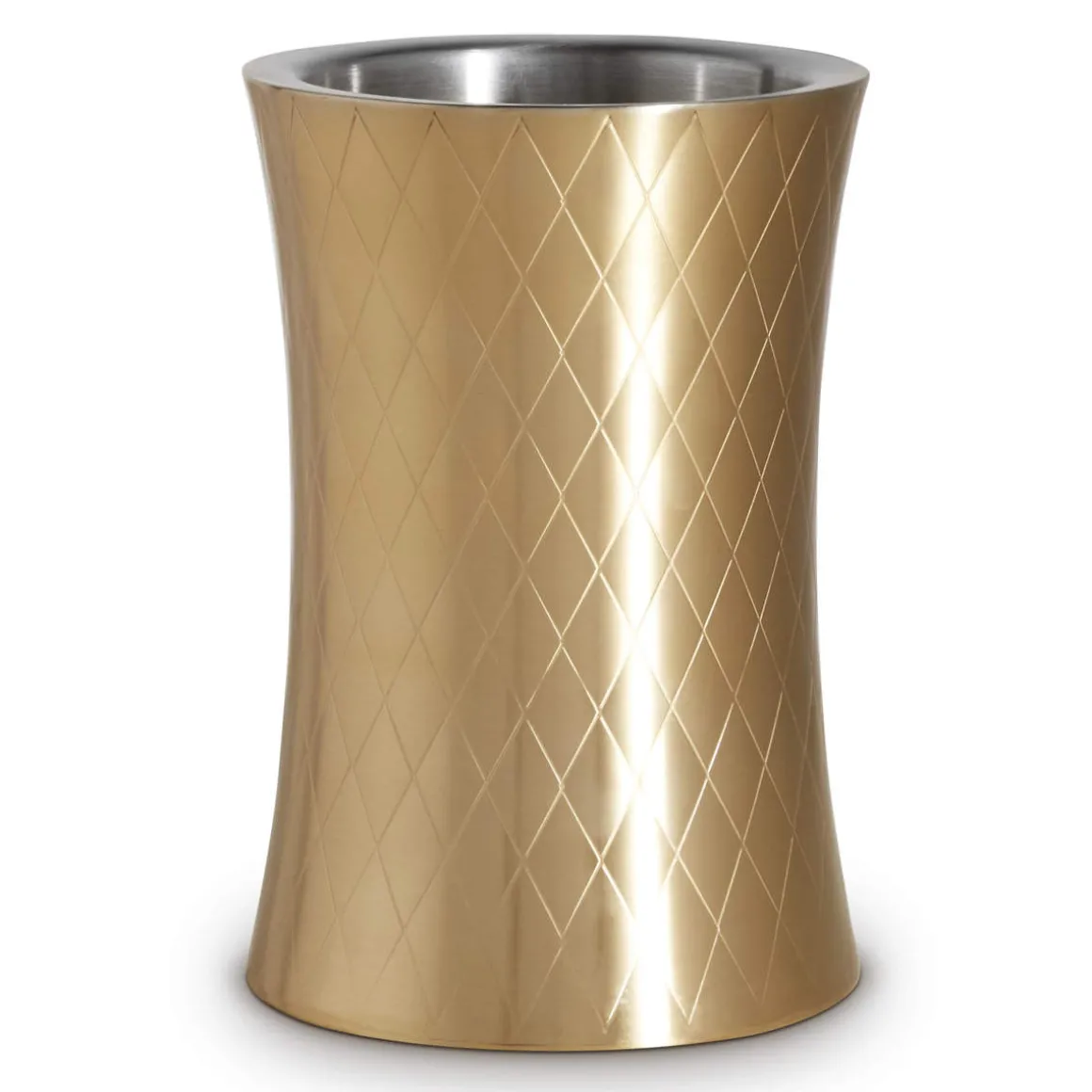 Doppelwandiger Flaschenkühler in Goldfarbe aus Edelstahl mit Diamantmuster. Die besonders elegante Optik des Flaschenkühlers wird durch die leicht taillierte Form der Außenwand unterstrichen. Die Innenseite des Flaschenkühlers ist zylindrisch, so dass die Funktion nicht beeinflusst wird durch die Taillierung. Die Innenseite des Flaschenkühlers ist gebürstet, wodurch Nutzungsspuren weniger auffallen.