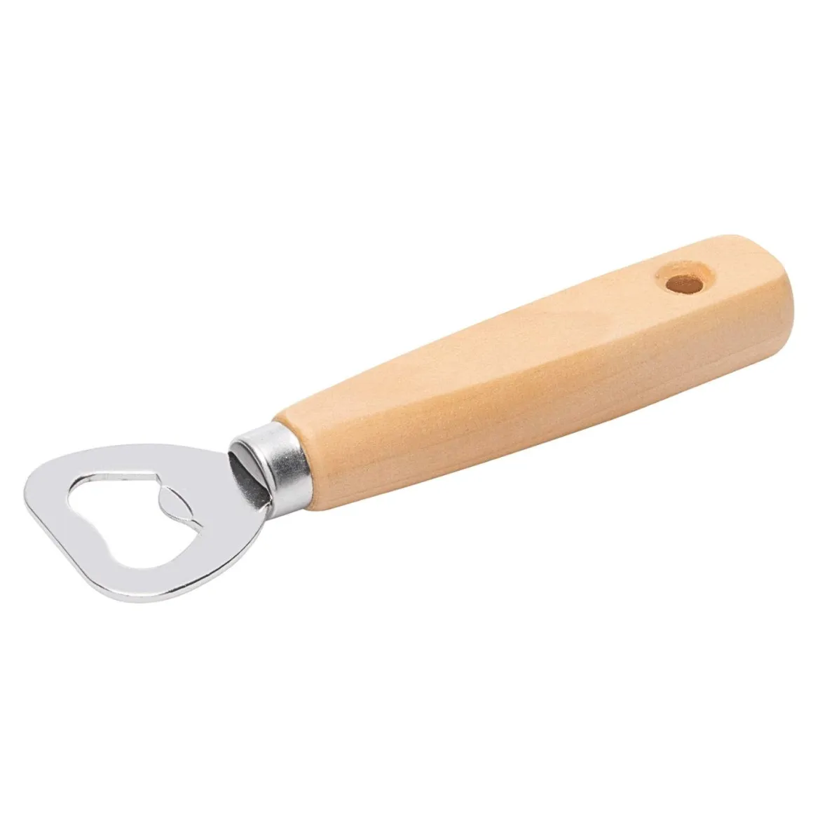 Flaschenöffner mit Holzgriff zum Öffnen von Kronkorken. Der Kapselheber hat eine Länge von 14,5 cm. Durch den Holzgriff liegt er angenehm in der Hand. Am Ende des Holzgriffes ist eine Öse mit der der Flaschenöffner an einem Faden befestigt werden kann.