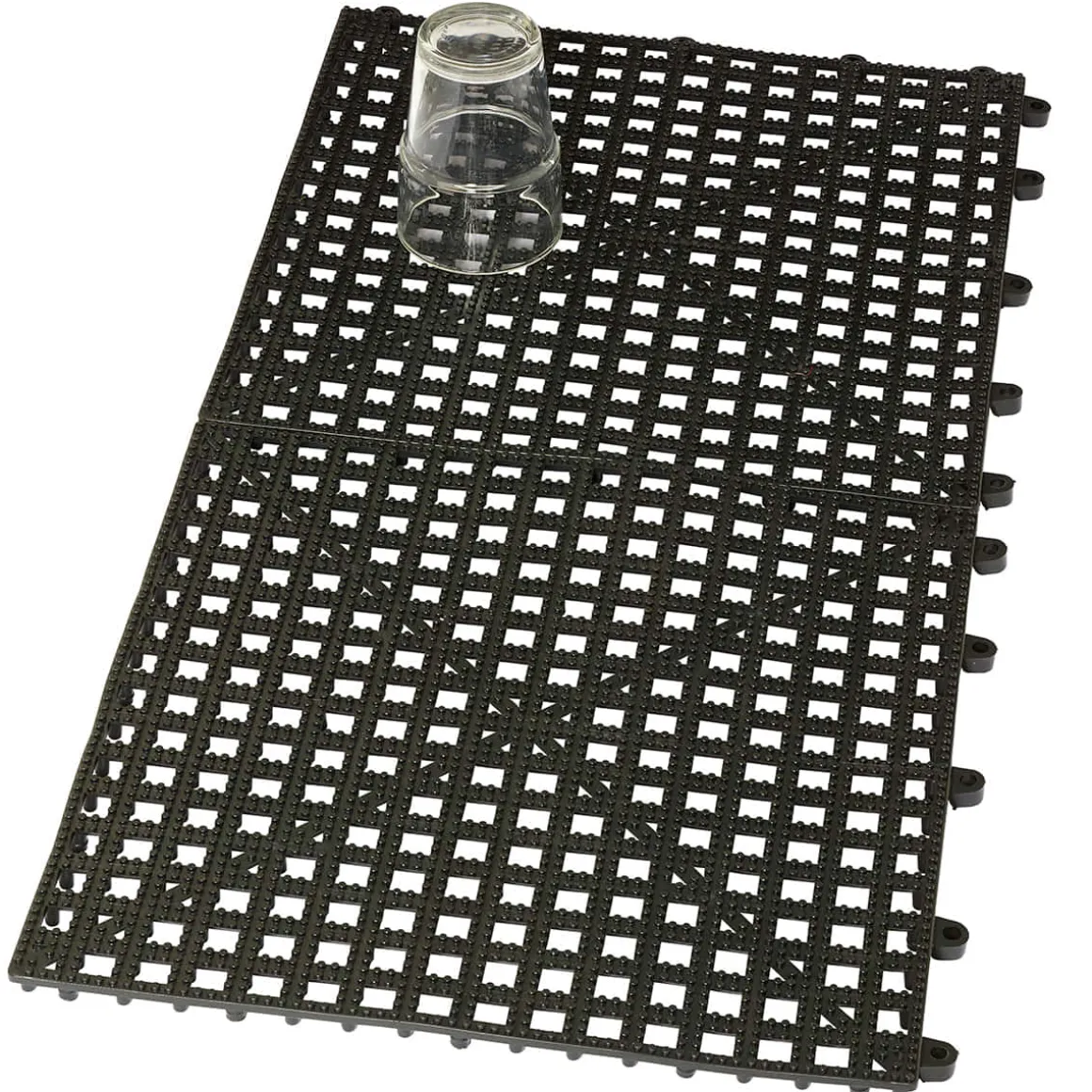 Robuste Abtropfmatte in stabiler Ausführung. Die Gläsermatten sind aus schwarzem Kunststoff hergestellt und haben ein Abstellfläche von 30 x 30 cm und eine Höhe von 1,5 cm. Die Gesamtgröße mit Verbindungsösen beträgt 31,5 x 31,5 cm. Die Gläsermatten können zusammengesteckt und beliebig erweitert werden.