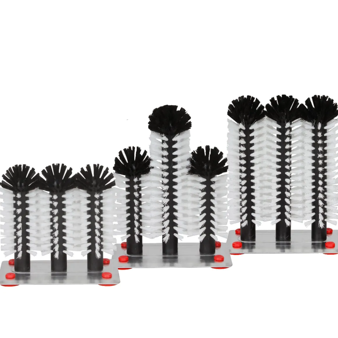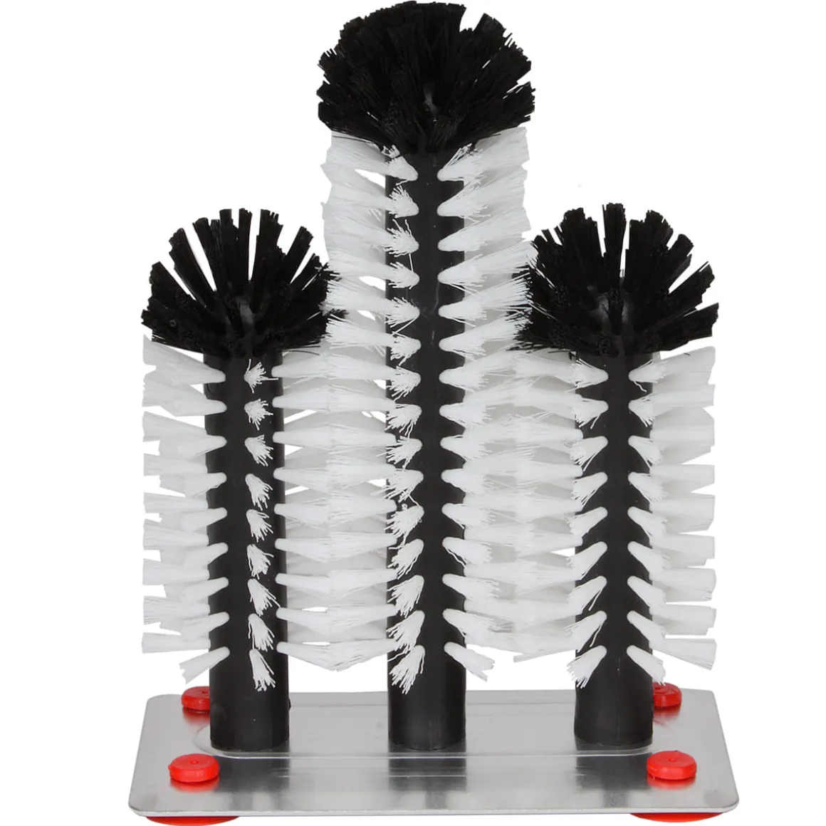 Glasspülbürste mit drei Bürsten auf einer rostfreien Metallplatte. Die beiden äußeren Bürsten sind 18 cm und die mittlere Bürste 25 cm hoch. Der Metallboden besitzt vier Saugnäpfe zum Befestigen im Spülbecken.