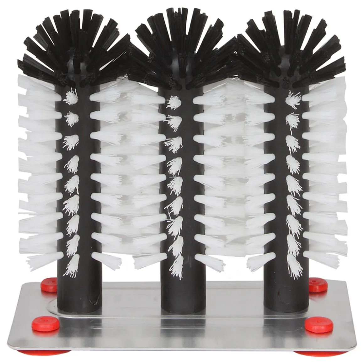 Glasspülbürste mit drei 18cm hohen Bürsten auf einer rostfreien Metallplatte. Der Metallboden besitzt vier Saugnäpfe zum Befestigen im Spülbecken.
