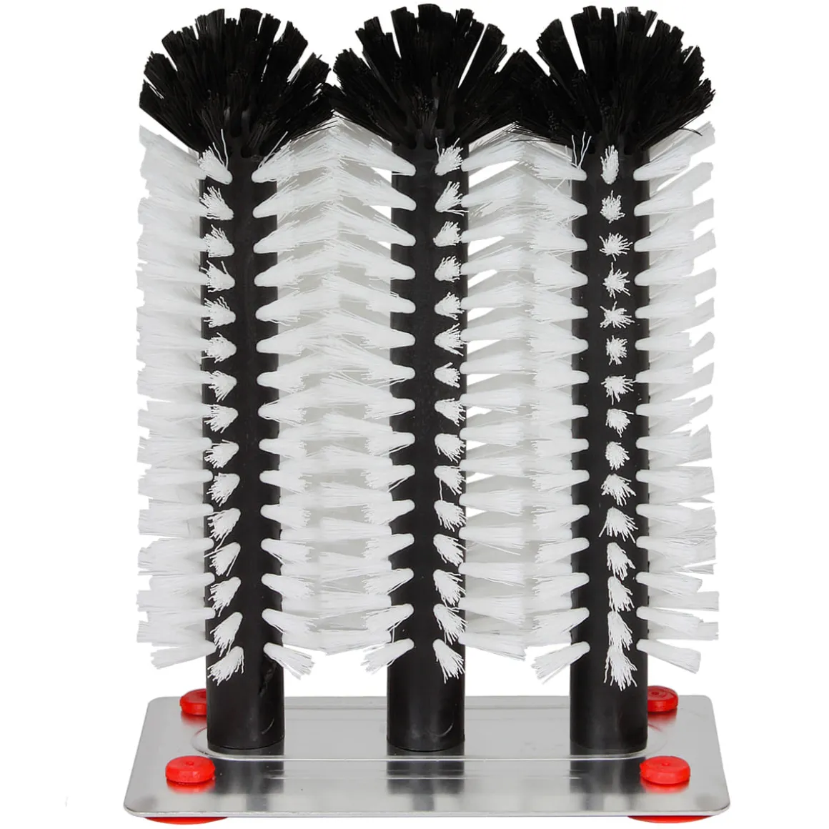 Glasspülbürste mit drei 25cm hohen Bürsten auf einer rostfreien Metallplatte. Der Metallboden besitzt vier Saugnäpfe zum Befestigen im Spülbecken.