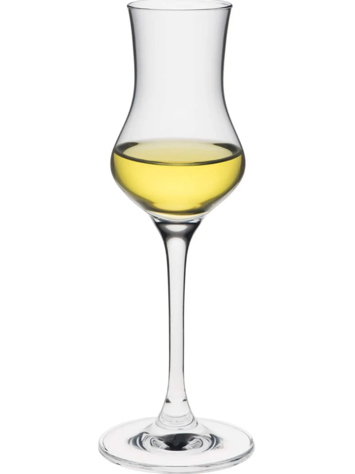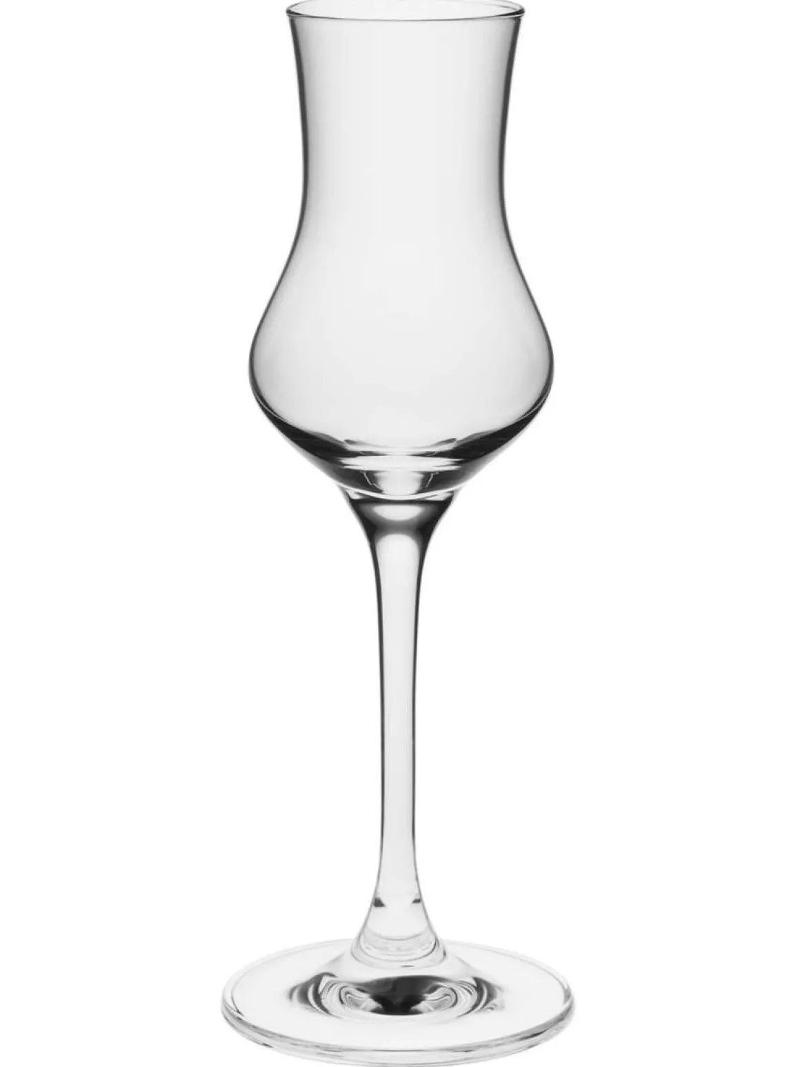 Elegantes Grappaglas aus Kristallglas. Das Grappaglas hat die typische Form mit langem Stiel und einer im unteren Bereich breiten Schale. Darüber verengt sich die Schale zur Mitte wieder und öffnet sich in einer fließenden Linie zum Mundrand.