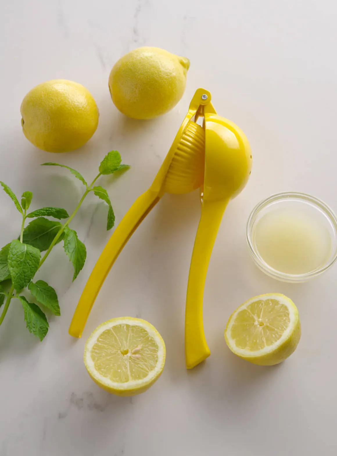 Die Handsaftpresse ist aus Aluminium hergestellt und Gelb pulverbeschichtet. Die Größe der Presse ist passend für Zitronen.