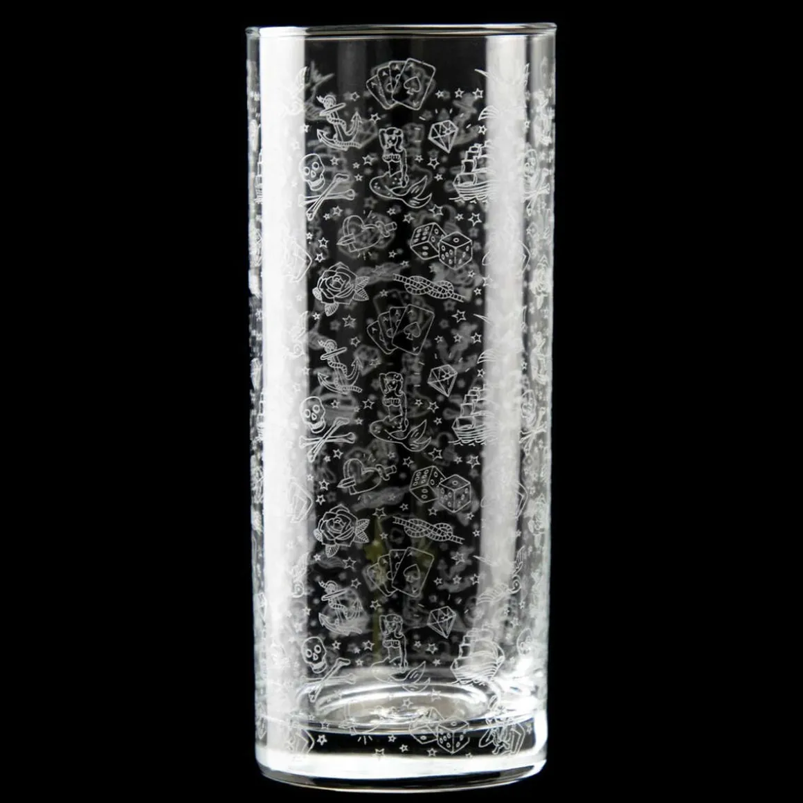 Das Highball Glas mit Tattoo Verzierung besitzt ein Volumen von 300 ml. Das klassisch geformte Highball Glas ist mit typische Seefahrer Tattoo-Motive wie Anker, Totenköpfe, Segelschiffe und Spielkarten verziert. Die eingeätzten weißen Motive sind spülmaschinenfest und beständig auf dem Glas.