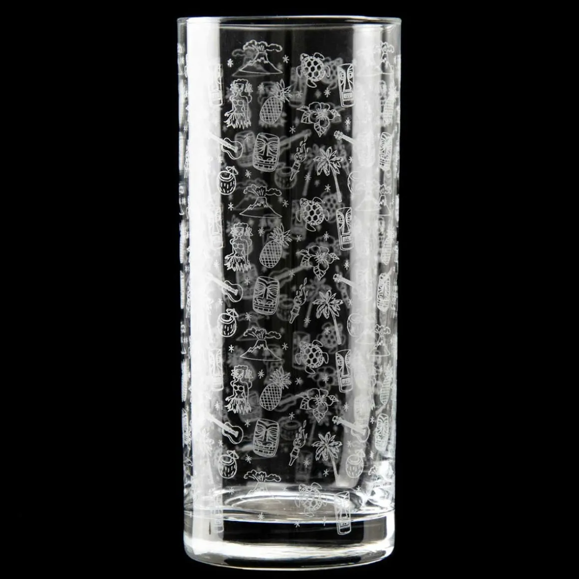 Das Highball Glas mit Tiki Verzierung besitzt ein Volumen von 300 ml. Das klassisch geformte Highball Glas ist mit typischen Tiki Motiven wie Kokosnüssen, Ananas, Palmen, Vulkanen und Schildkröten verziert. Die eingeätzten weißen Motive sind spülmaschinenfest und beständig auf dem Glas.