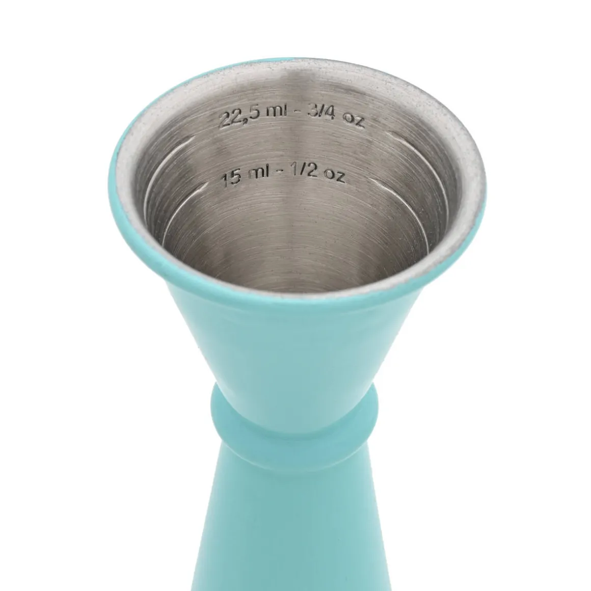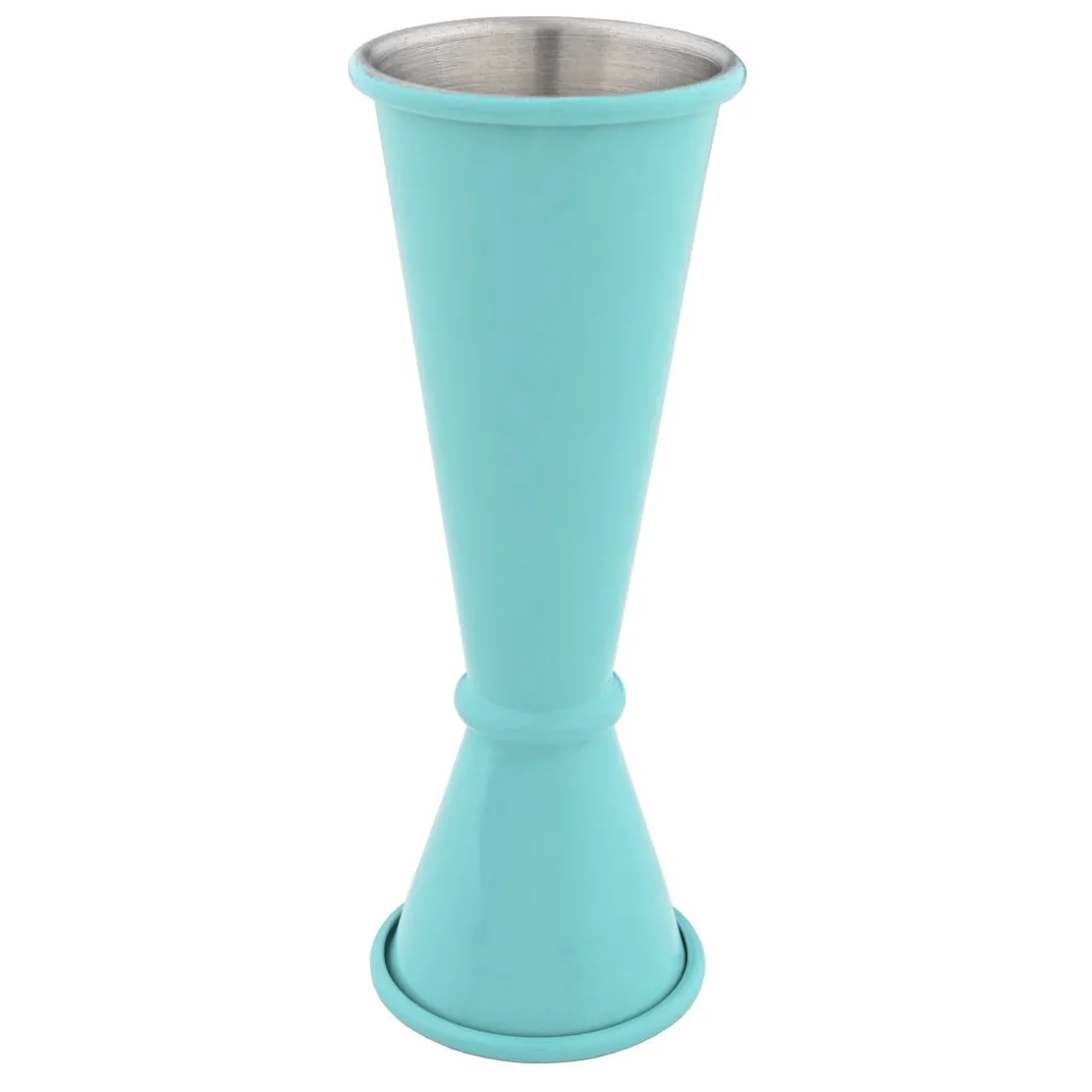Jigger Japan aus Edelstahl in Türkis. Das Barmaß hat die für japanische Jigger typische Form mit zwei langgezogen, konischen Messbechern. diese sind mit einem kleinen Ring verbunden.