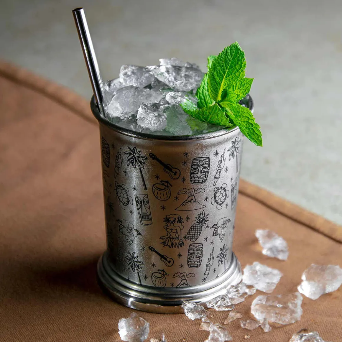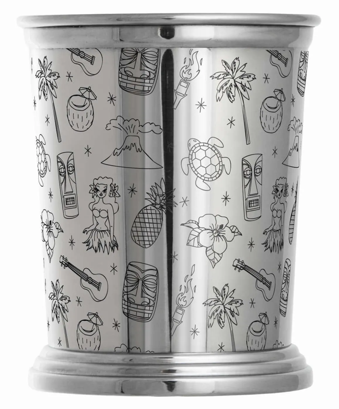 Julep Cup aus poliertem Edelstahl für Cocktails. Die klassische Form des Julep Bechers wurde mit Motiven im Tiki-Stil verziert. Bringen Sie Urlaubsfeeling und einen Hauch tropische Idyle in ihre Bar.