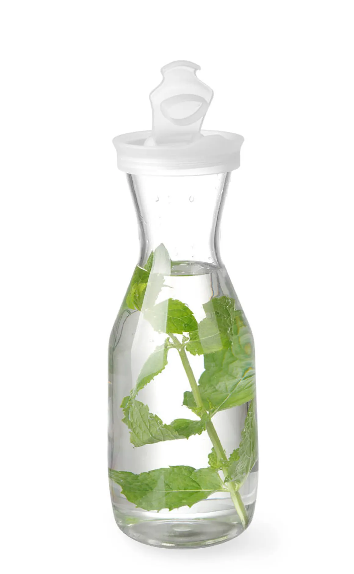 Transparente Karaffe mit einem Volumen von 1 Liter mit Deckel. Karaffe und Deckel bestehen aus Kunststoff. Der weiße Deckel besitzt eine Klappe um die Öffnung zum Eingießen gegen Insekten und Staub zu verschließen. Der Deckel wird mit einem Gewinde auf die Karaffe aufgeschraubt.