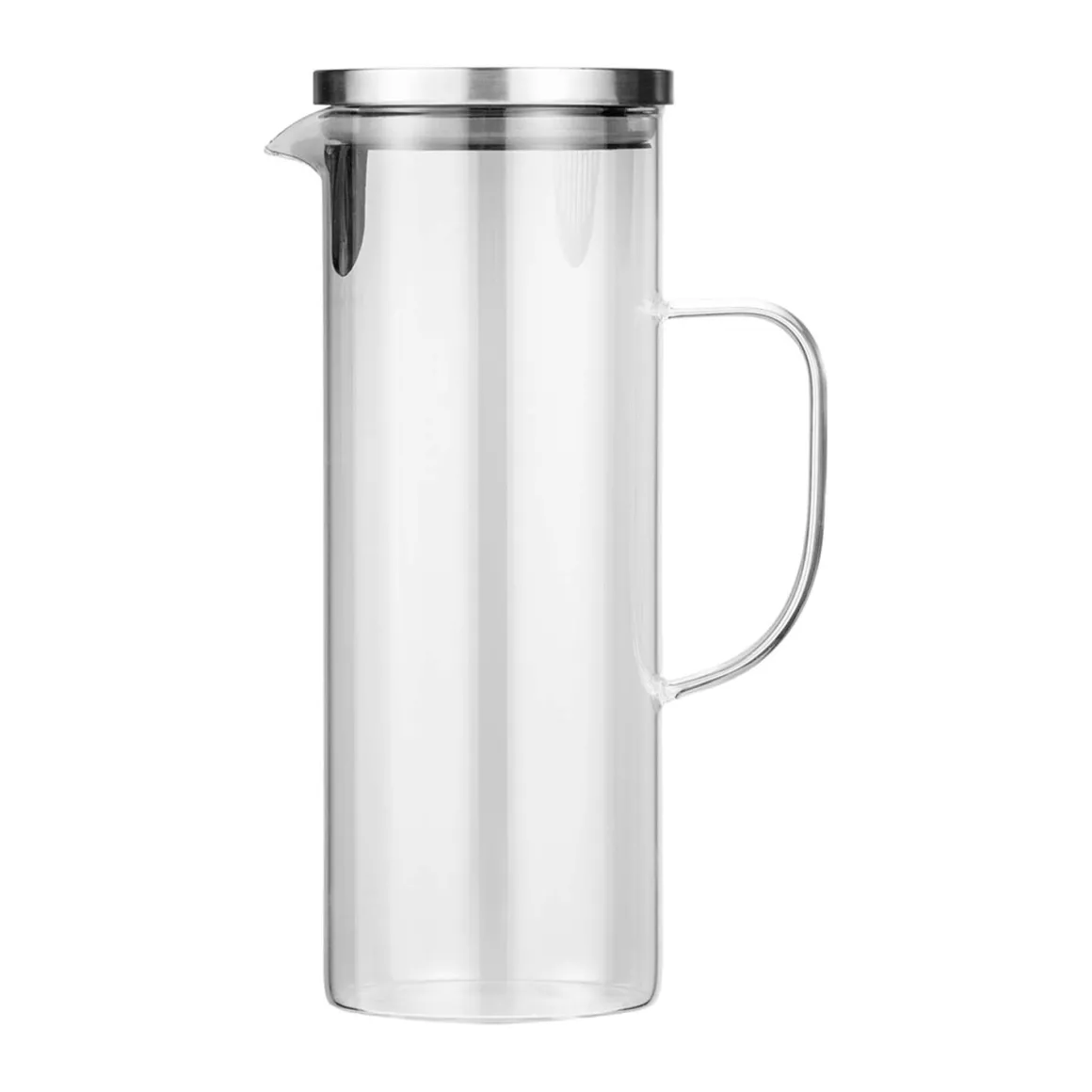 Karaffe mit Henkel und Edelstahl-Deckel mit einem Volumen von 1,5 Liter. Die Karaffe besteht aus Borosilikatglas.