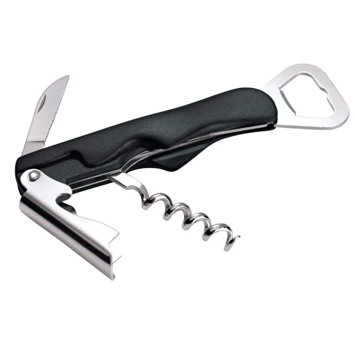 Dieses verchromte Kellnermesser mit schwarzem Griff überzeugt durch seine stabile Ausführung und angenehme Handhabung. Mit einer Länge von 13,5 cm bietet es einen guten Hebel beim Öffnen von Weinflaschen und ist somit ideal für den professionellen Einsatz in der Gastronomie geeignet. Der integrierte Kapselheber macht es besonders nützlich.