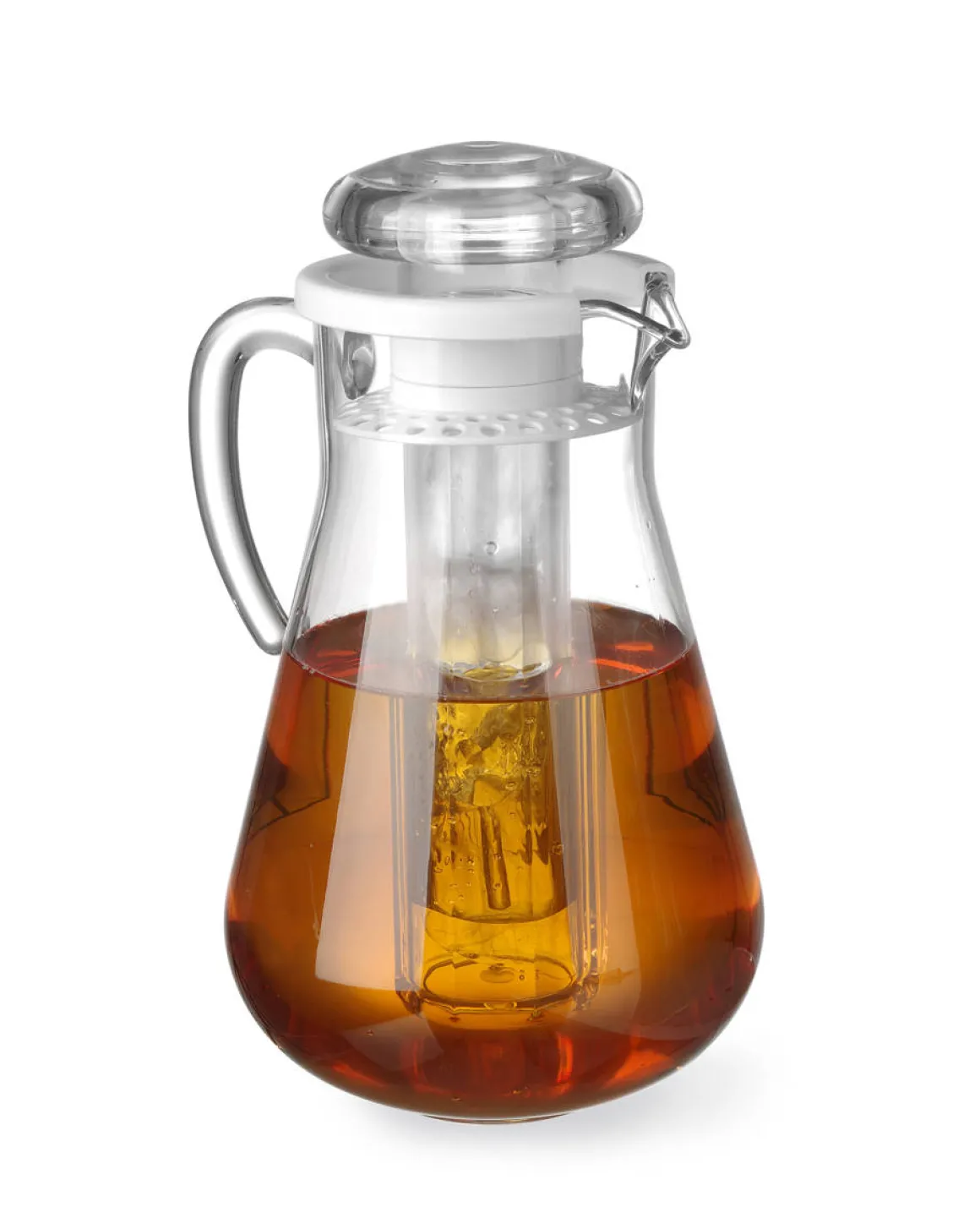 Transparenter Krug mit Deckel und einer zylindrischen Halterung für Eiswürfel. Halten sie Ihre Getränke auch im Sommer lange kühl ohne sie zu verwässern.