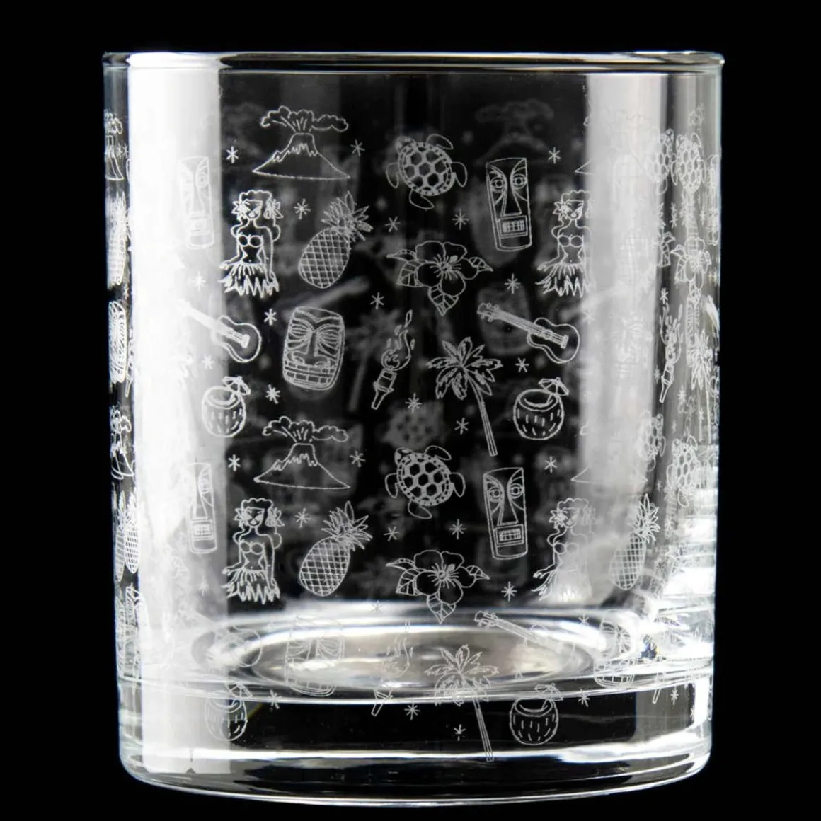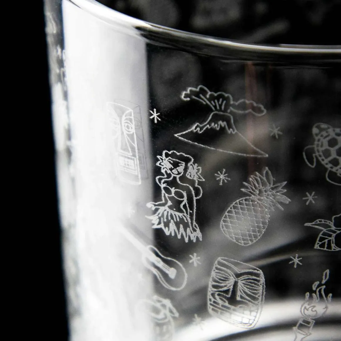 Das Old Fashioned Glas mit Tiki Verzierung besitzt ein Volumen von 250 ml. Das klassisch geformte Old Fashioned Glas besitzt gerade Außenwände und einen ca. 1cm dicken massiven Glasboden. Die Außenseite des Cocktailglases ist mit typischen Tiki Motiven wie Kokosnüssen, Ananas, Palmen, Vulkanen und Schildkröten verziert. Die eingeätzten weißen Motive sind spülmaschinenfest und beständig auf dem Glas.