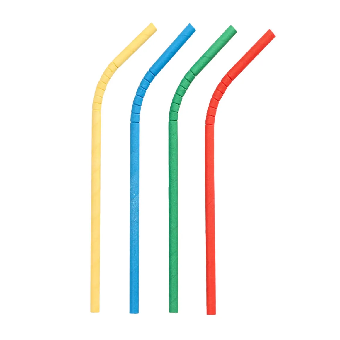 Biegbarer Strohhalme aus Papier in bunten Farben. Die Trinkhalme haben eine Länge von 22 cm und einem Durchmesser von 6 mm. Die Papierstrohhalme haben einen biegbaren Abschnitt.