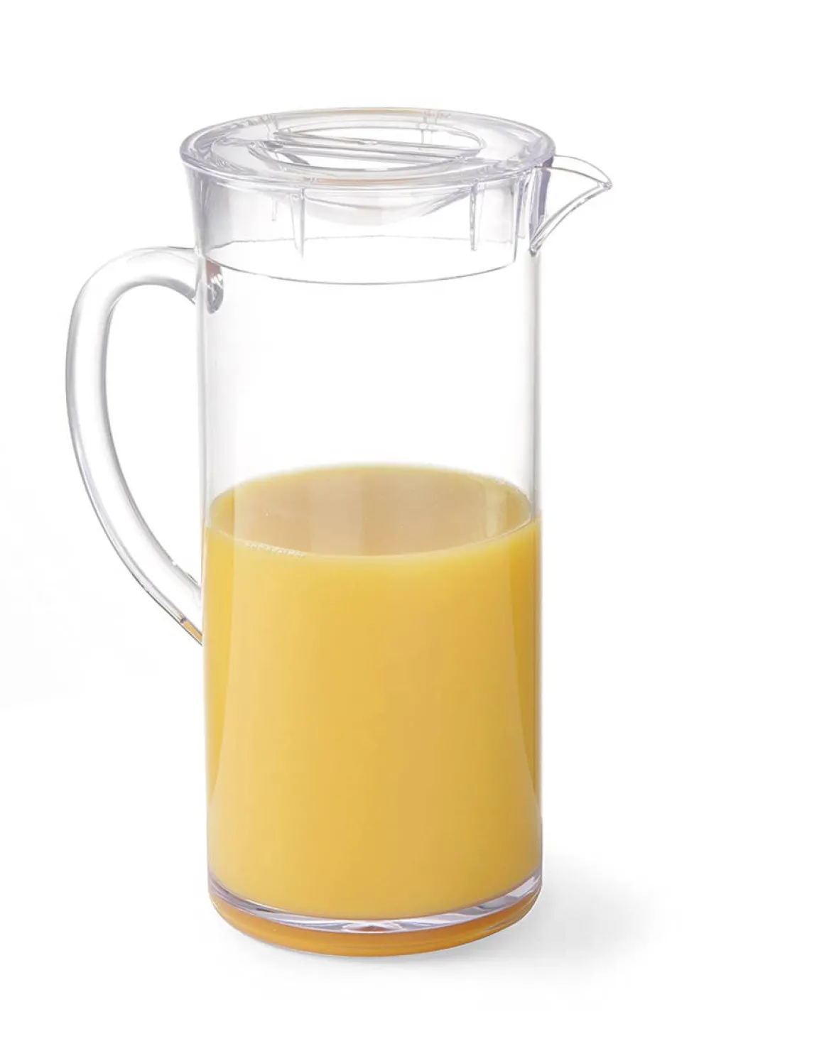 Transparente Saftkanne Henkel, Ausgusslippe und Deckel. Die Kanne aus Kunststoff besitzt eine zylindrische Form und hat ein Fassungsvermögen von 2 Litern. Zum Schutz des Inhalts kann ein Deckel mit integriertem Griff aufgesteckt werden.