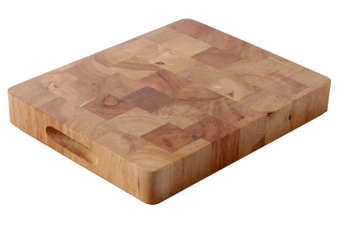 Schneidbrett aus Kautschuk-Holz mit Griffmulde. Das Schneidbrett hat entspricht GN 1/2 mit einem Maß von 32,5×26,5 cm.