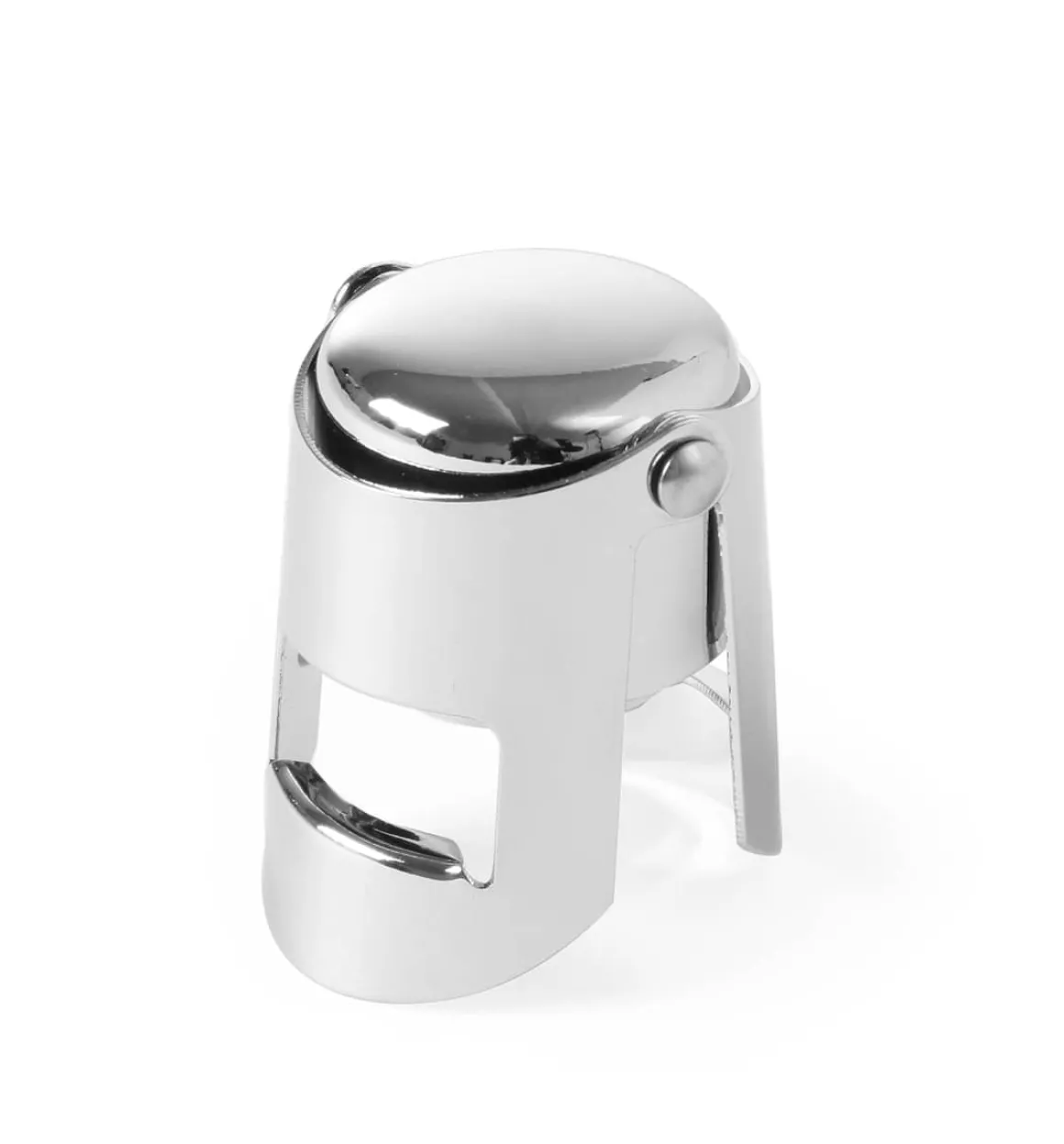 Verchromter Sektverschluss mit zwei Flügeln. Mit Silikondichtung, welche über die Flaschenöffnung gelegt wird. Die beiden Flügel drücken die Dichtung auf die Flasche, so dass die Kohlensäure nicht entweicht.