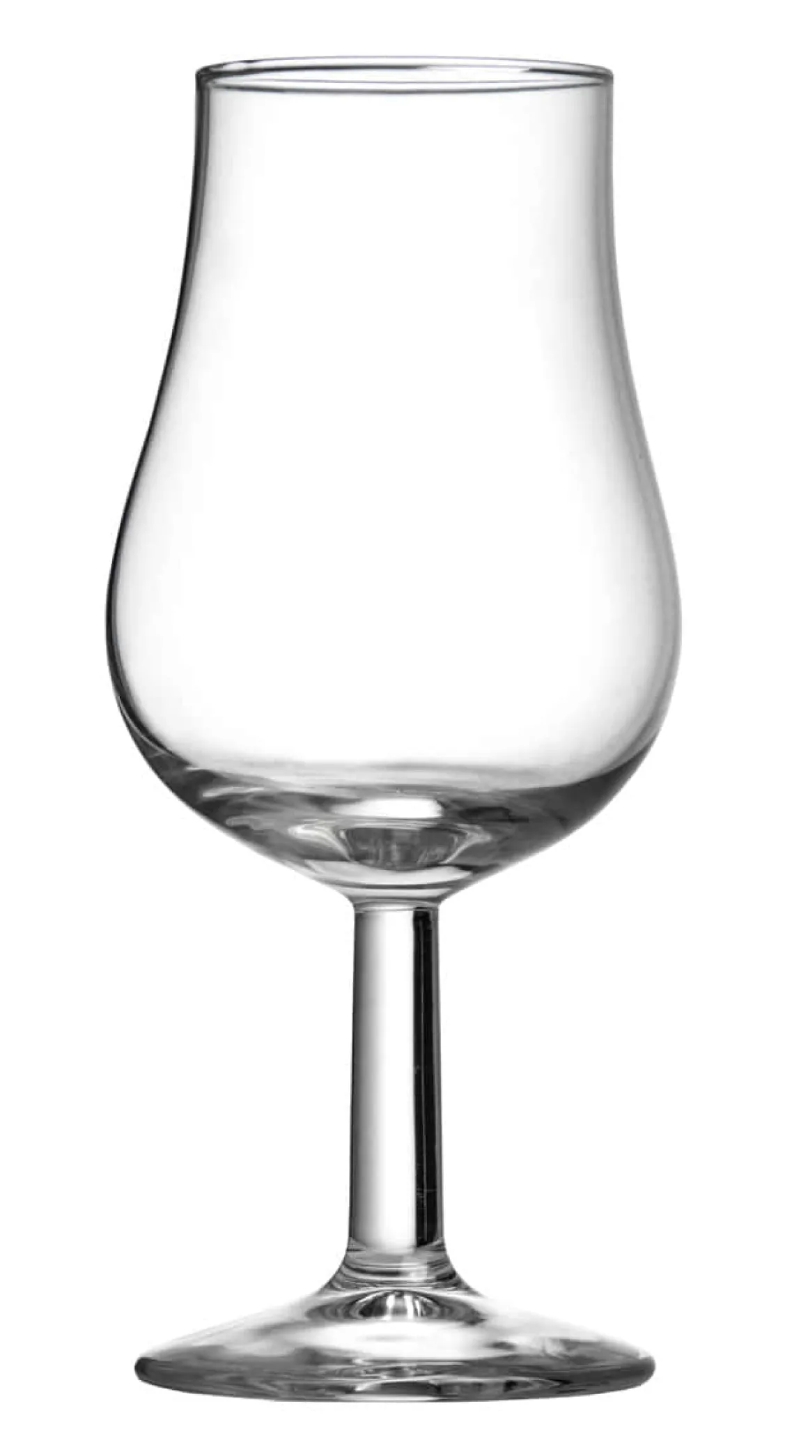 Tulpenförmiges Tastingglas für Whiskys. In der abgerundeten Schale lässt sich der Whisky gut schwenken und die nach oben verengende Form bündelt die Aromen und leitet sie in die Nase für ein optimales Tasting des Whiskys.