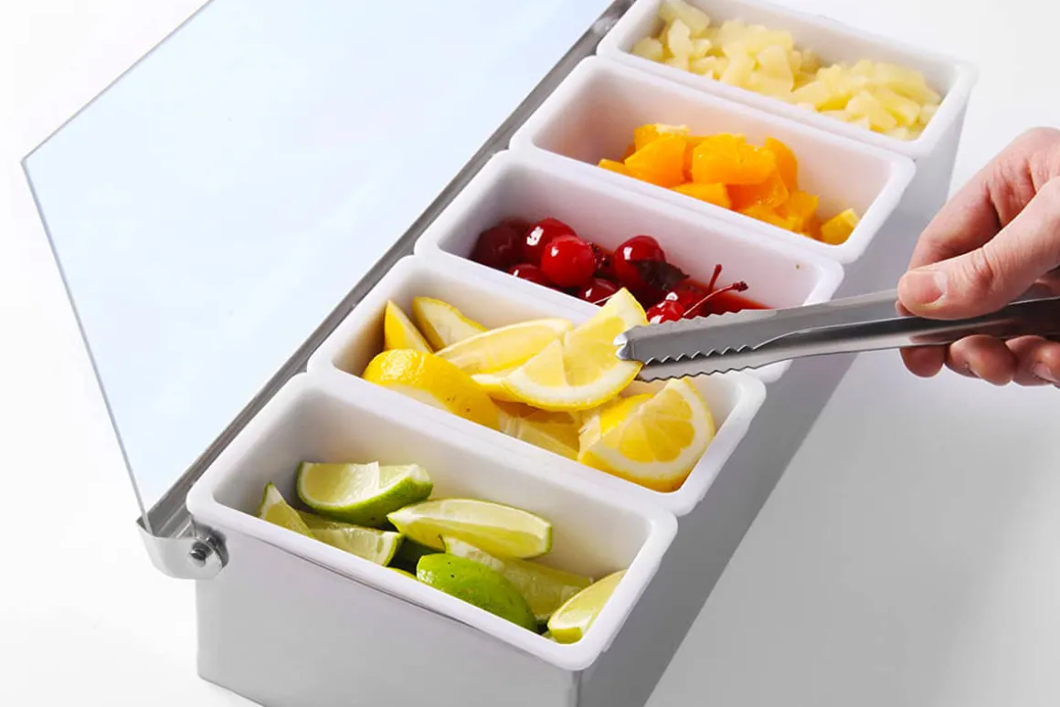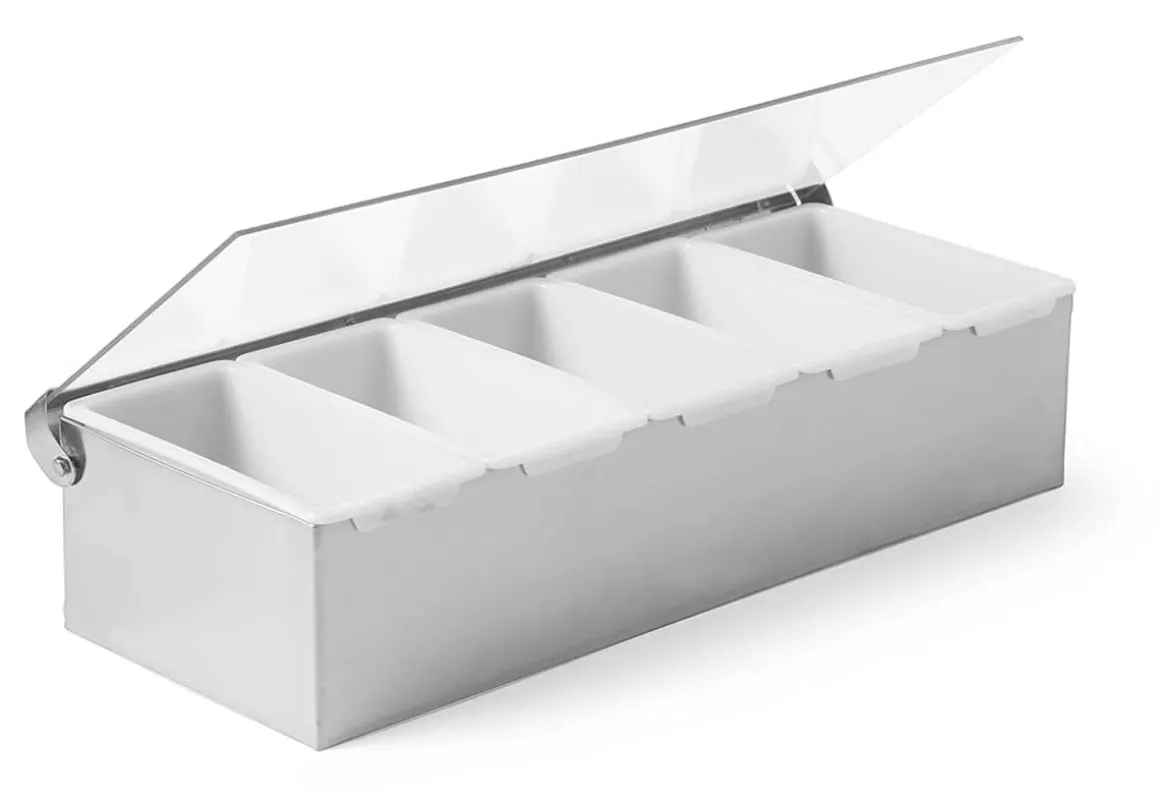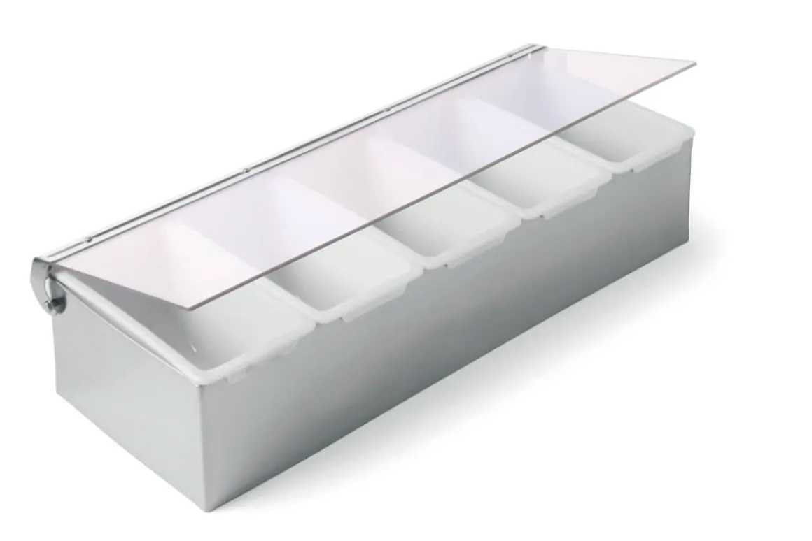 Zutatenbehälter aus Edelstahl mit fünf Fächern für Cocktailzutaten. Der transparentem Deckel kann aufgeklappt werden. Die weißen Zutatenfächer können zum Reinigen und Befüllen einzeln entnommen werden.
