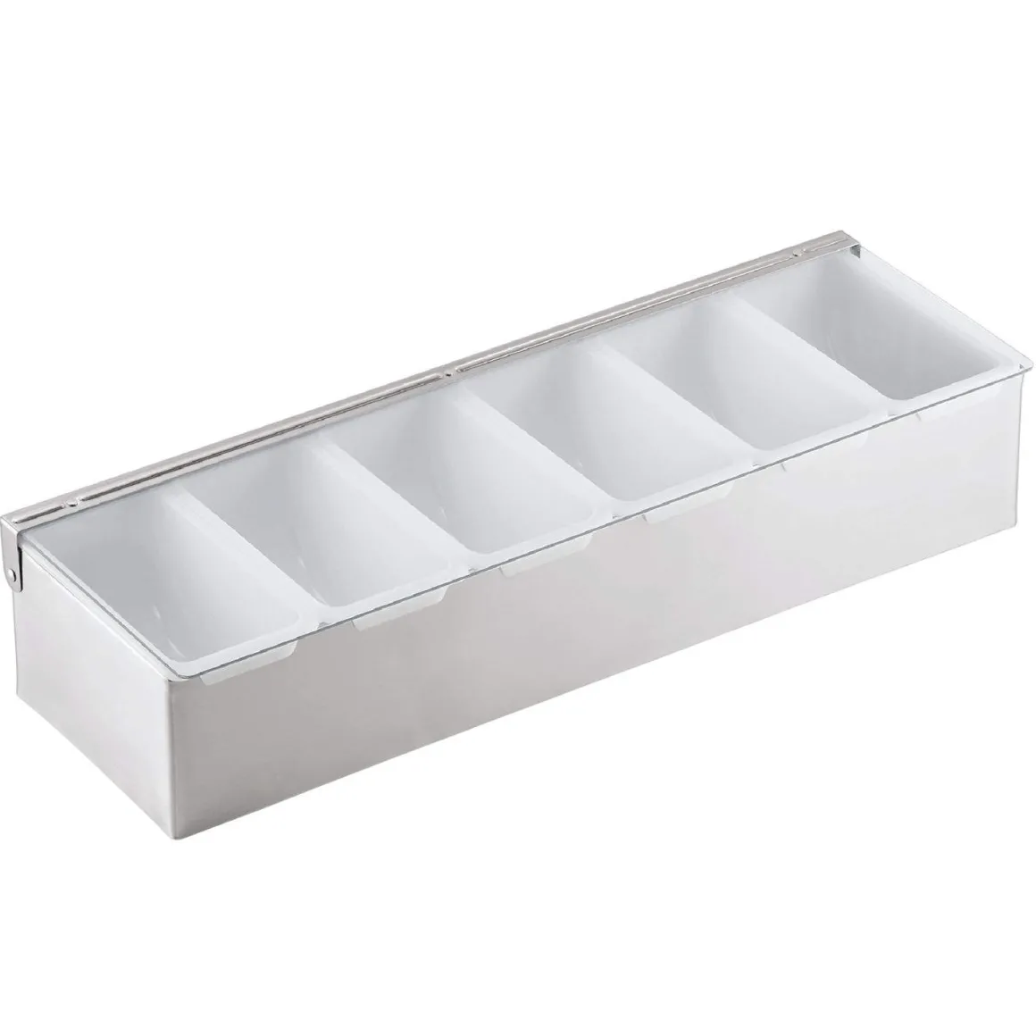 Dieser Zutatenbehälter aus Edelstahl verbindet hygienisches Material mit funktionalem Design. Die sechs Einsätze aus Kunststoff mit einem Volumen von jeweils 0,45 Litern ermöglichen eine saubere und übersichtliche Aufbewahrung von Bar-Zutaten.