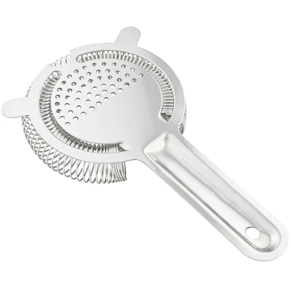Barsieb mit eng gedrehter Spirale aus Edelstahl. Das Barsieb hat einen Griff mit Loch zum Aufhängen und zwei Zinken zum Auflegen auf den Cocktailshaker. Die Trägerplatte besitzt im Halbkreis angeordnete Löcher und seitlich zwei Schlitze über der Spirale durch die der Cocktail hindurchlaufen kann.