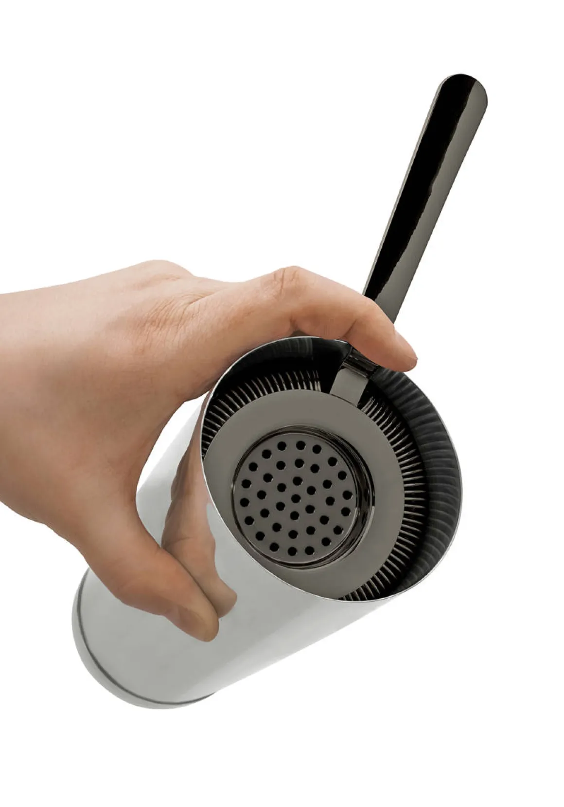 Hawthorne Strainer aus Edelstahl mit schwarzer Beschichtung. Bei diesem Barsieb ist die Trägerplatte für die Spirale rund geformt und etwas kleiner als üblich. Die eng gedrehte Spirale wurde auf die Außenkante der Trägerplatte gesetzt und läuft vollständig um diese herum. Hierdurch erhält der Hawthorne Strainer wieder einen großen Durchmesser. Außerdem wurden keine Arme zum Auflegen auf den Shakerrand angebracht. Statt dessen besitzt der Griff eine Kerbe zur Fixierung des Barsiebs am Rand des Shakers oder Rührglases.