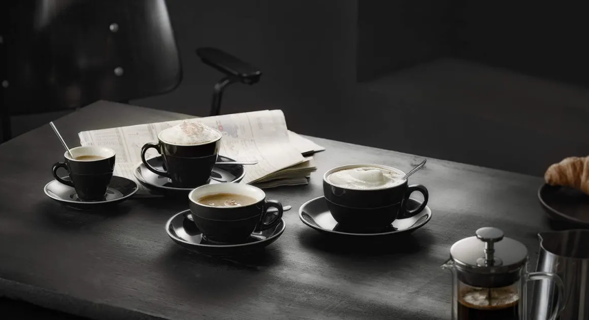 6 schwarze Caffé Latte Tassen aus Porzellan mit elegantem Design und einem Volumen von 350 ml.
