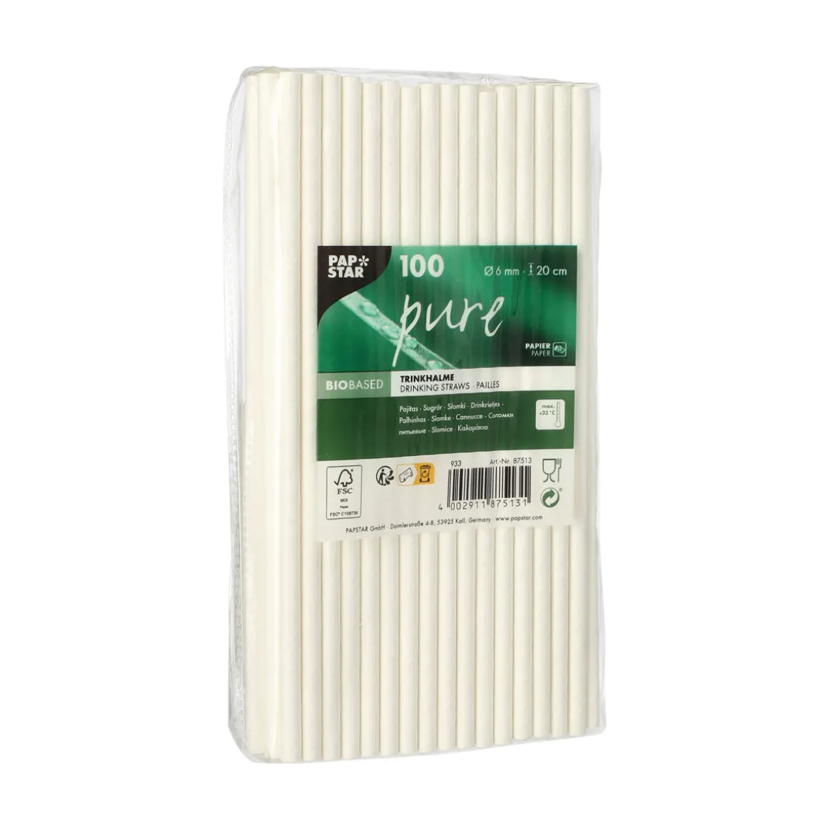 Cocktail Papierstrohhalm | Weiß – Ø 6 mm x 20 cm – Papstar Pure (100 Stk)